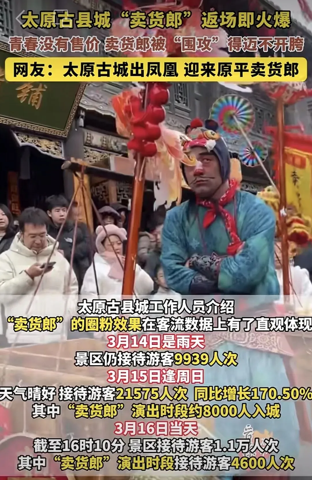 数据是最有力的证明。今年春节,太原古县城入园人数达89.8万人次。而在3月14日卖货郎返场后,即便遇到雨天,景区游客量依然暴涨。3月15日周日,天气晴好,景区接待游客21575人次,同比增长170.50% ,其中卖货郎演出时段就有约8000人入城 。