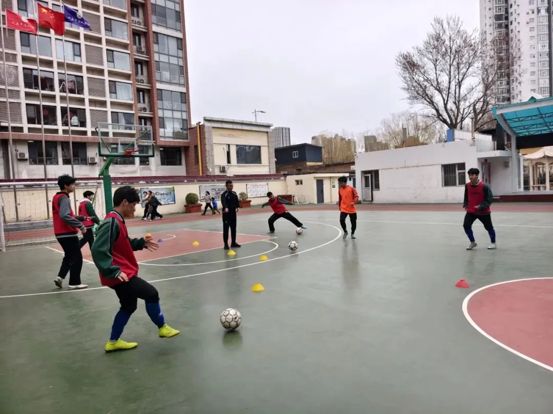 校园足球队在大课间时段展开紧张有序的训练。学生们首先进行热身运动,认真完成高抬腿、压腿、扭腰等准备活动,进入技能练习环节后,有的同学独自练习曲线运球,有的则两两配合进行传接球练习,整个校园洋溢着蓬勃向上的运动氛围。