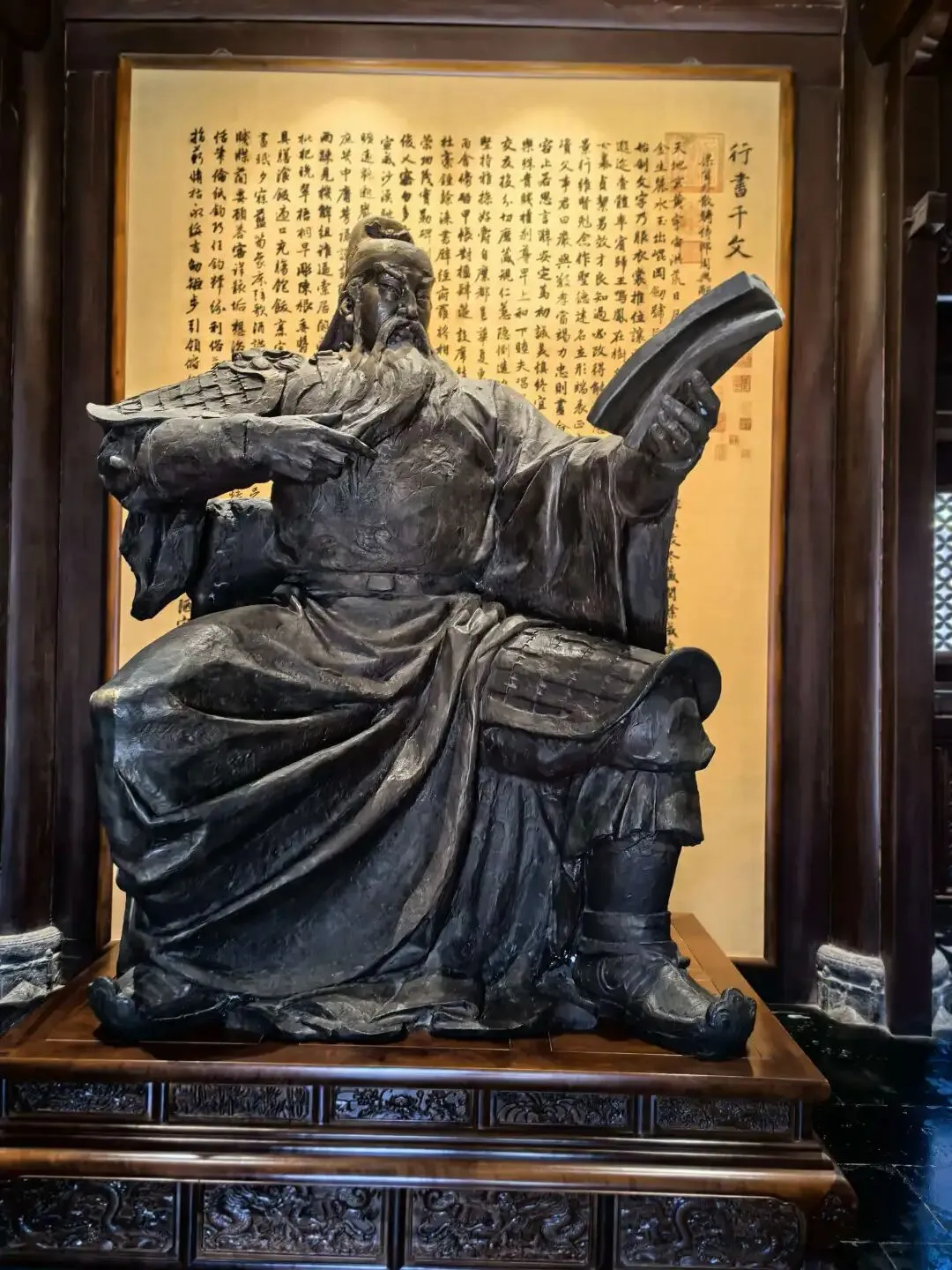 在御书楼里看到关公手拿一本书在阅读,同伴说这来自于关公夜读春秋的典故,在晋商文化中供奉关公塑像,代表着信义。