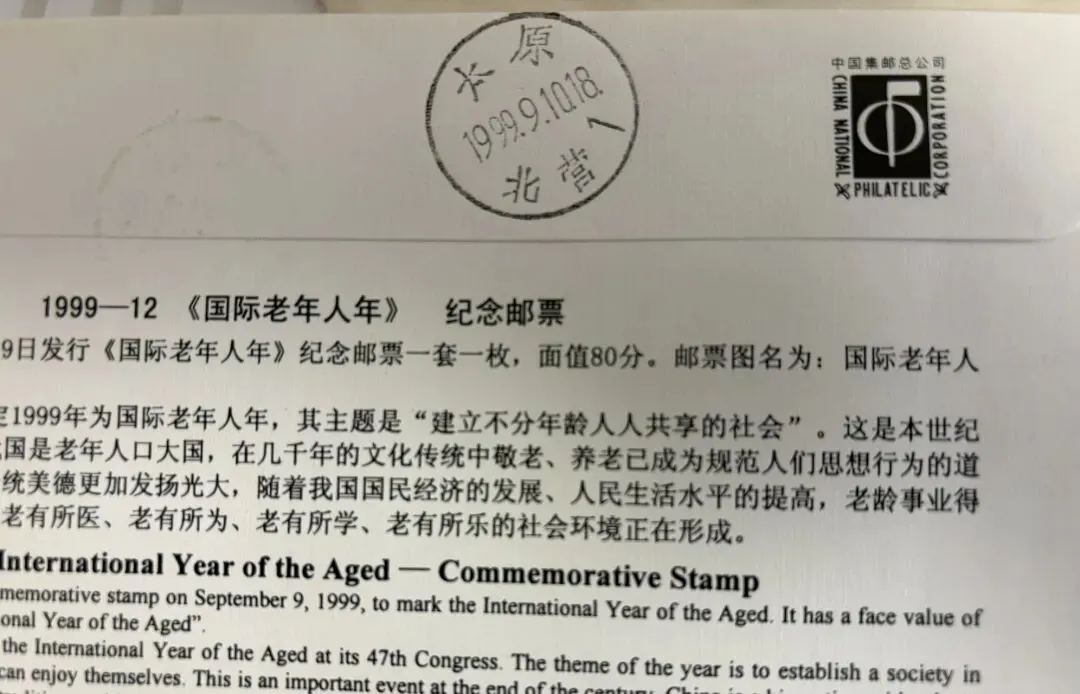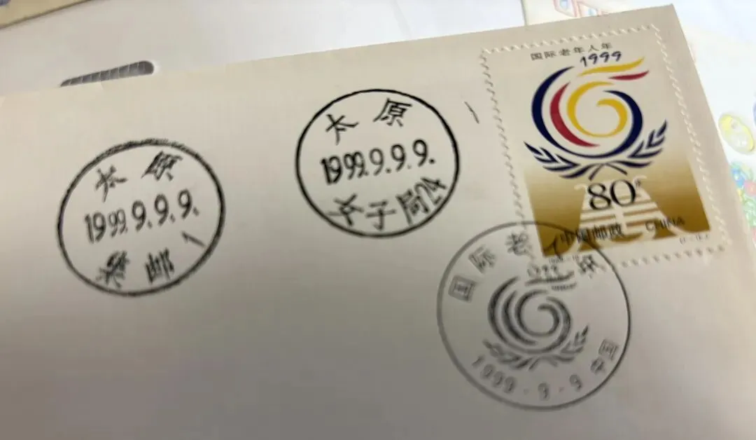 1999年是国际老人年。如图,这个实寄封盖的邮戳是1999年9月9日9时,连续6个9,一千年一遇吧。落地戳是次日。本市次日达,而且票面干干净净,邮政一直这么靠谱。实寄封是集邮品的一种,它要求有邮票、有寄出局邮戳和到达局邮戳(也叫落地戳),邮戳上的时间地点是它的价值所在,无论过多少年都可以看出寄自何年何月何日何时何地,成为一种永恒。这枚实寄封邮戳上的“女子局”是太原市五一广场的女子邮局,我上学的时候经常过那里,应该是只有女职工没有男职工吧,我没有考证过,也是太原市的特色邮局。不知道现在还在不在,太原的朋友们有知道的请留言。