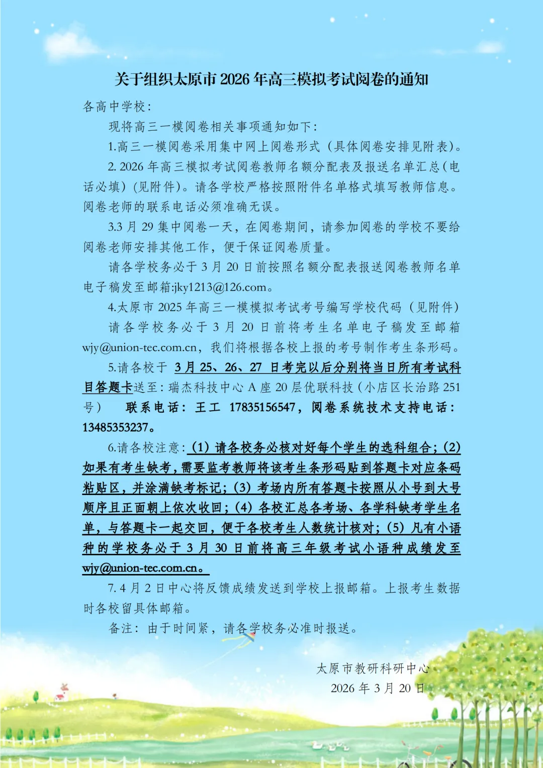 【重要通知】关于组织太原市2026年高三一模考试集中阅卷的通知
