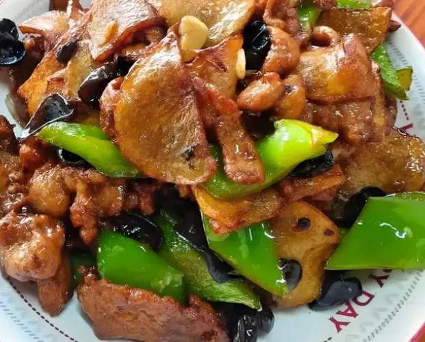 过油肉做法很家常:里脊切片上浆,热油滑散捞出;再起锅爆葱姜蒜,加木耳黄花,烹醋、酱油、糖和高汤勾芡,肉回锅翻匀。酸香一起来,饭就下得快。