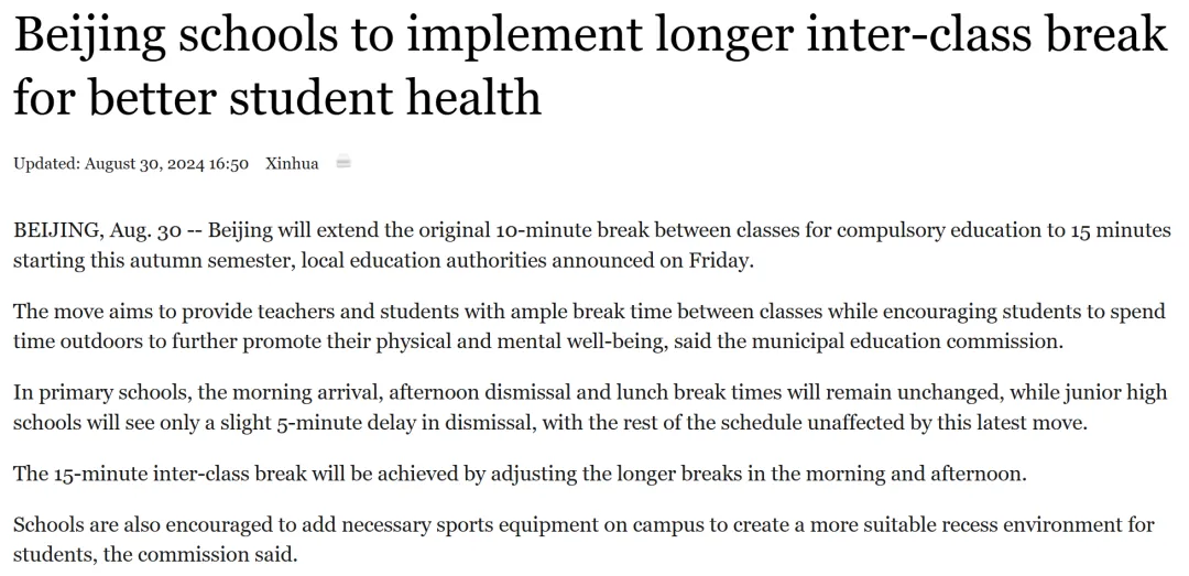 其实早前就从《21世纪报》和新华社新闻网站上看到过相关倡议新闻,呼吁延长中小学生课间休息时间,保障孩子在校活动与休整时长,也早有一些城市在践行这项举措。如今太原也落地这项新政,实打实把“健康第一”的理念落到了校园实处,作为家长,看着都觉得暖心。