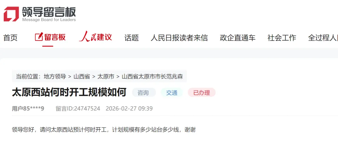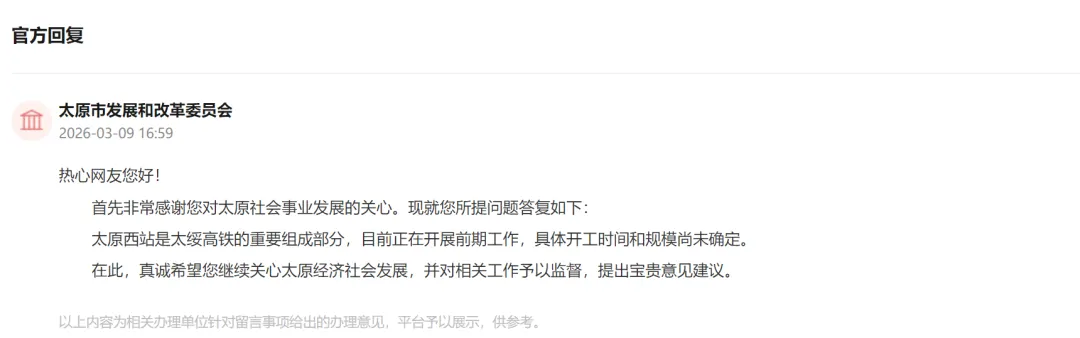 记者从人民网领导留言板获悉,网友询问太原西站何时开工?