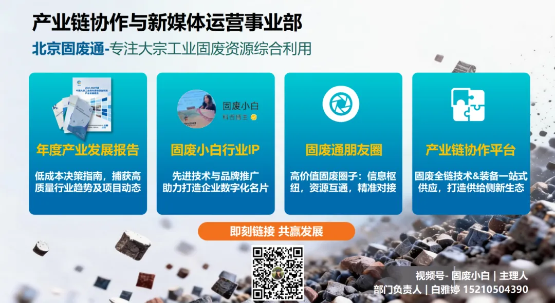 会议会员事业部:大宗固废全产业链信息服务,包括煤矸石、粉煤灰、工业副产石膏、钢铁冶金渣、有色冶炼渣、赤泥、建筑垃圾等大宗工业固废综合利用信息集成、宣传推广、会议培训、科技成果转化、项目参观考察、区域工业固废精准招商会议等,专业负责煤矸石、粉煤灰、工业副产石膏、钢铁冶金渣、有色冶炼渣、赤泥、建筑垃圾等大宗工业固废固废管家咨询服务+固废综合利用技术解决方案+固废综合利用技术选型方案+固废产业规划询,面向行业提供工业固废综合利用科技技术成果转化等。深度提供工业固废产业政策,洞悉产业走向,服务矿山、能源等固废企业。
