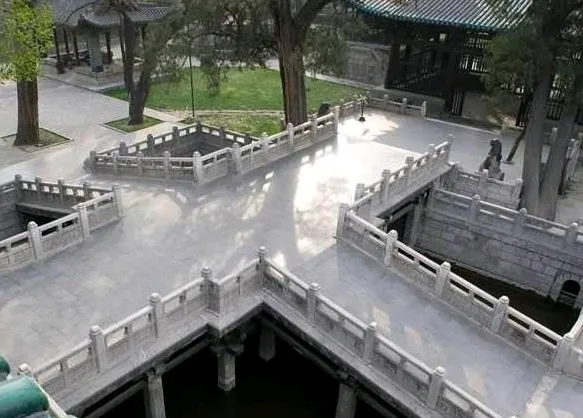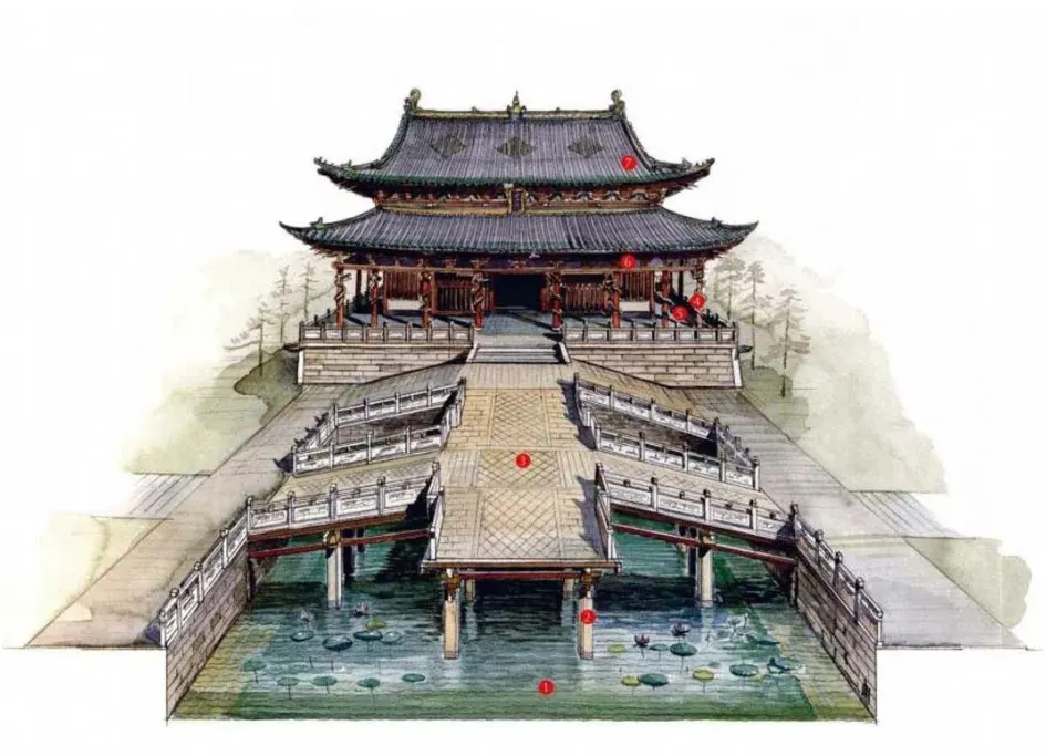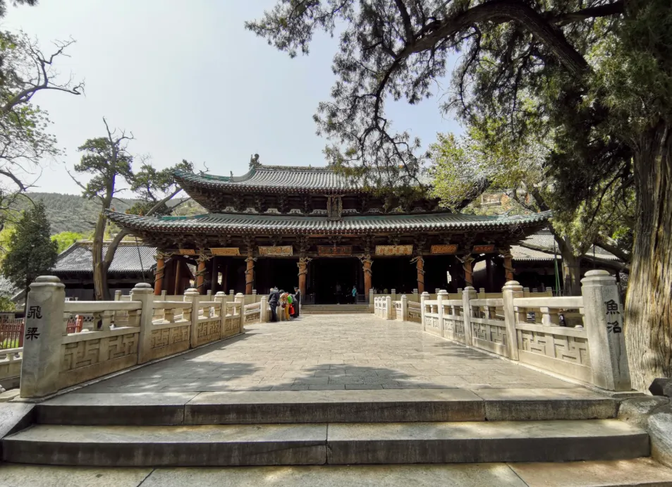 鱼沼飞梁:位于圣母殿与献殿之间,是我国现存古桥中极为罕见的十字形古桥。桥下为方形鱼池(古人称方为沼),池中立有34根小八角石柱,柱上架斗拱,斗口十字相交,以承接梁、额与横梁,而梁上架有十字桥面,由中心向四周伸下阶梯连接四边地面,即“飞梁”。这种结构在古画中偶见,实物则仅此一孤例,梁思成先生曾盛赞其“实为可贵”。