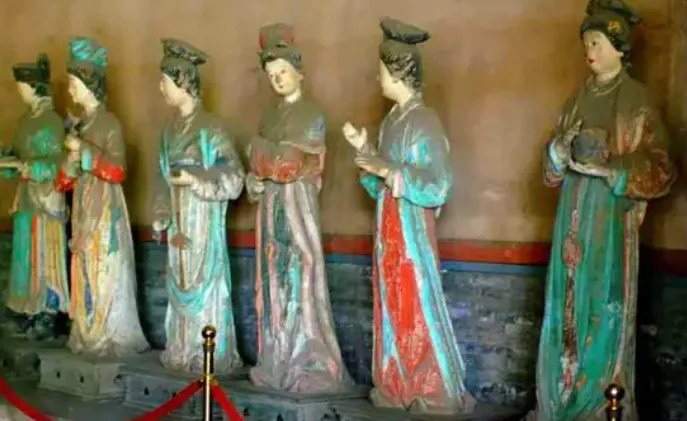 这些塑像如真人大小,比例准确,姿态自然,是根据宋代宫廷“六尚制”塑造的。她们各有专职,身份、性格无一雷同:有负责饮食起居的,有负责洒扫梳妆的,有负责奏乐歌舞的。其中,最著名的当属那尊“双面佳人”和“俏皮侍女”。一尊侍女像,半面脸喜,半面脸忧,将内心的矛盾刻画得淋漓尽致;另一尊则微微侧首,眼神俏皮,仿佛在窃窃私语,充满了人间烟火气。这些彩塑不仅是中国雕塑史上的瑰宝,更是研究北宋宫廷生活、衣冠服饰的“活字典”。