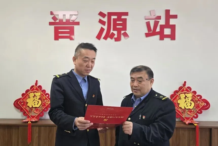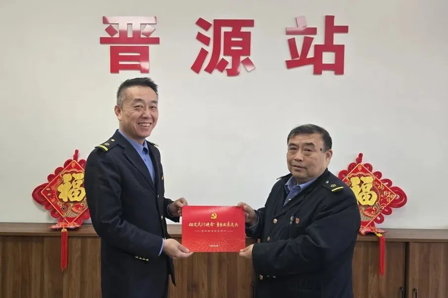近日,晋源站党支部书记为值班站长谢建洲送上政治生日贺卡,勉励这位党龄36年的老党员继续扎根运输一线,把每一次接发车、每一趟试风作业当作践行使命的考场,以钢轨为笔、以信号灯为墨,在保障运输安全、服务职工的征程上勇毅前行,让党徽在信号楼与隧道间熠熠生辉。