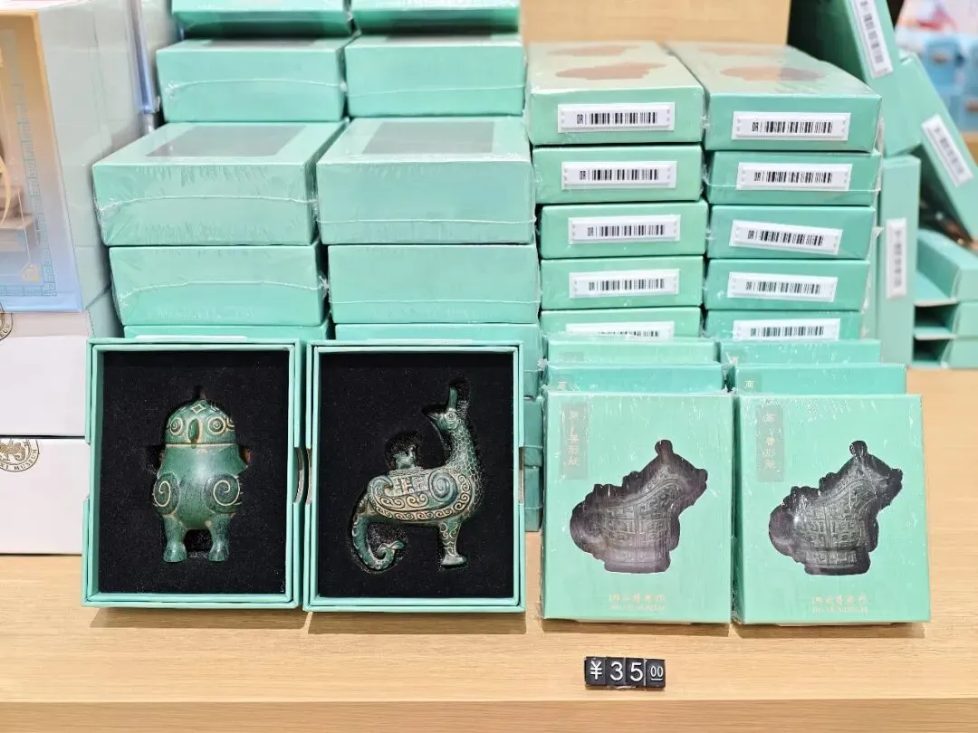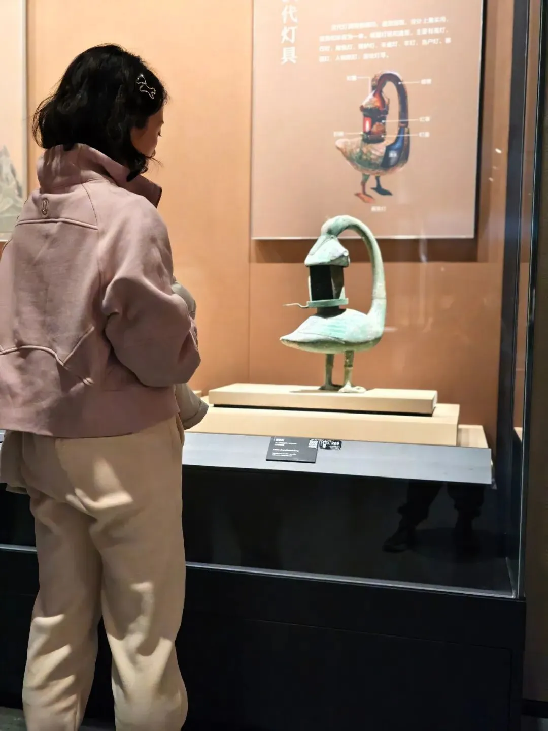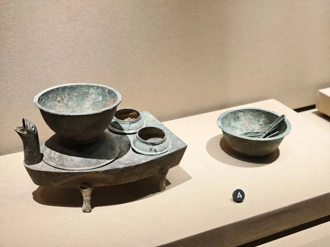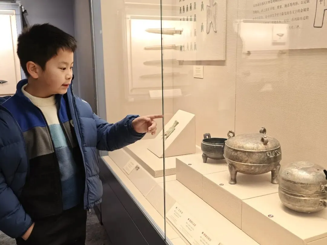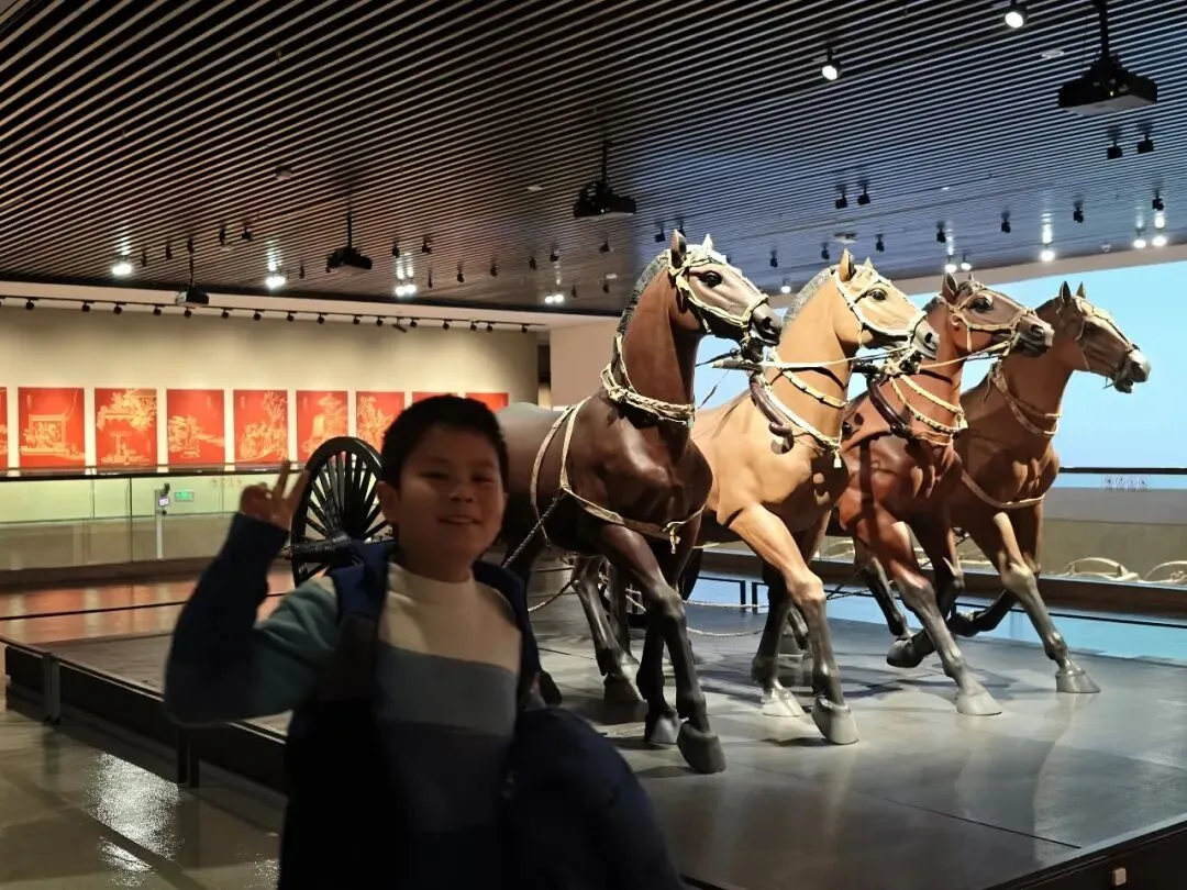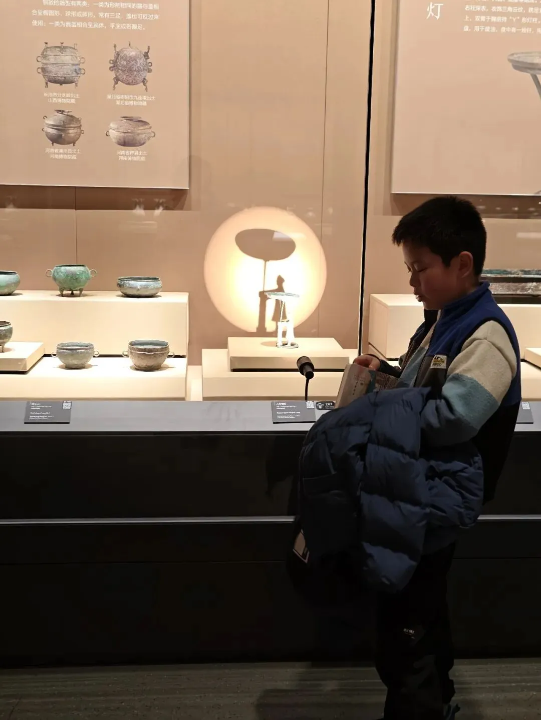 专程来看的雁鱼铜灯,这个在陕西省博物院也有一个差不多的,但是那个没有彩绘。鱼腹与雁颈为中空管道,灯盘燃烧产生的油烟会顺着管道进入雁腹,雁腹可盛水,油烟遇水溶解,实现烟尘净化,是世界最早的 “环保灯具” 之一。汉代铜灶。灶面开有一大两小三个火眼:大火眼上置大铜釜(主炊煮器),小火眼上置两个小铜釜(可温酒、热食或煮小份食物)。我俩逛完继续去文创店买买买,娃爸还在慢慢看,小朋友已经迫不及待拆盒了。也真的是非常冷,风也大,我们全副武装,继续去下一站。
