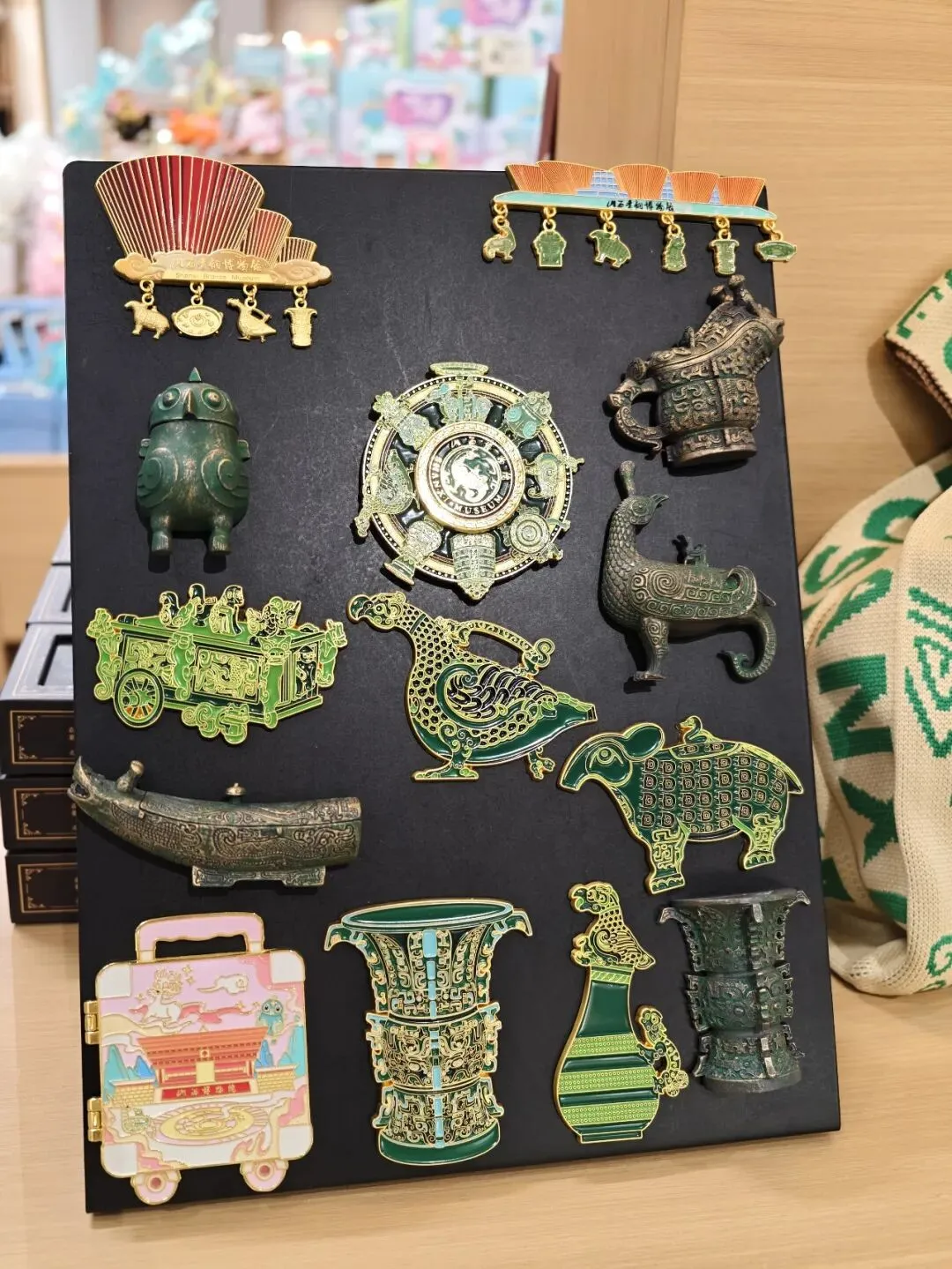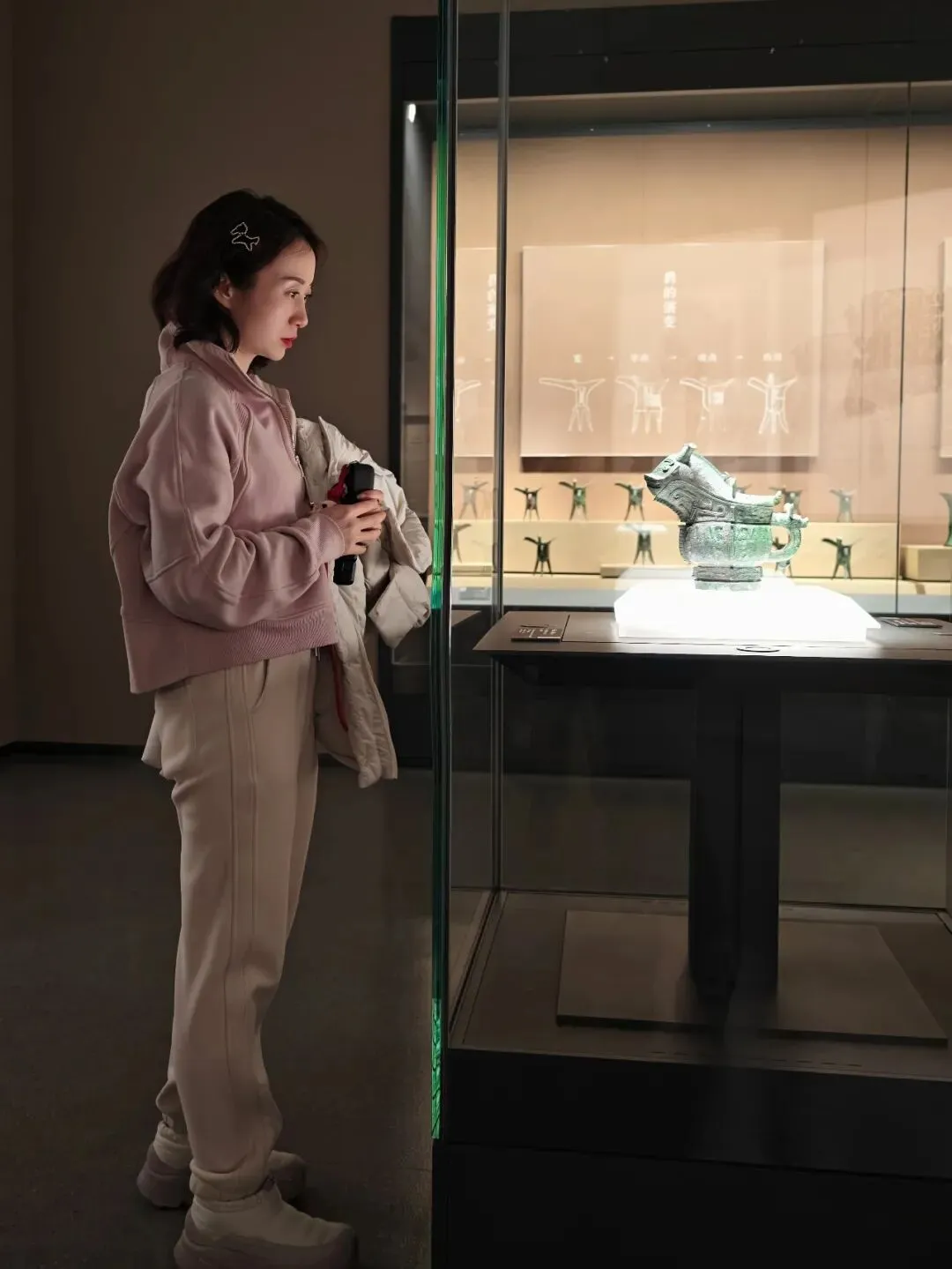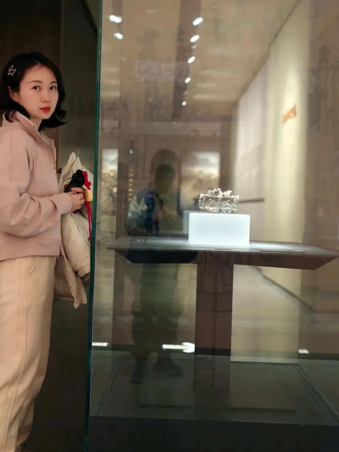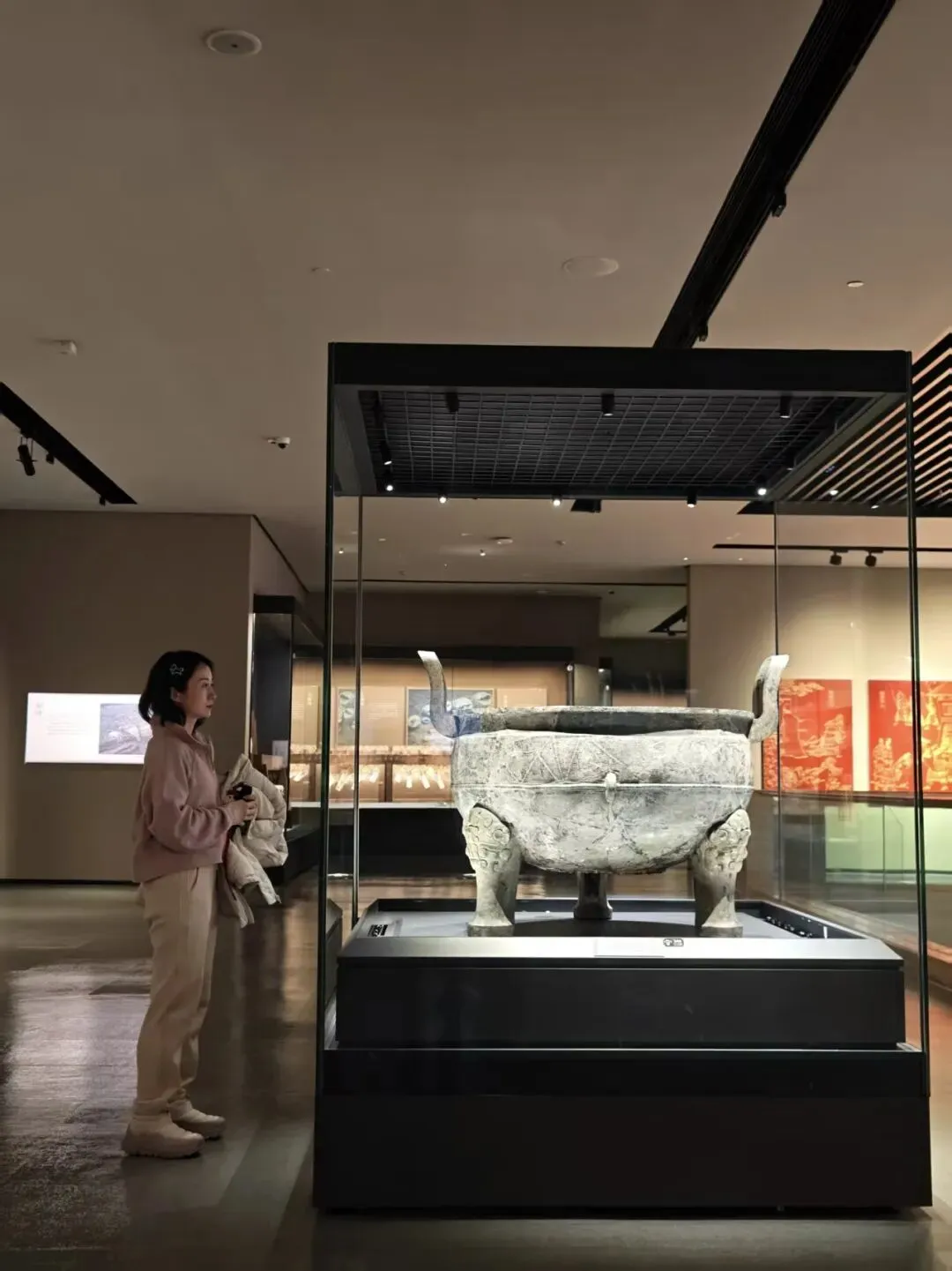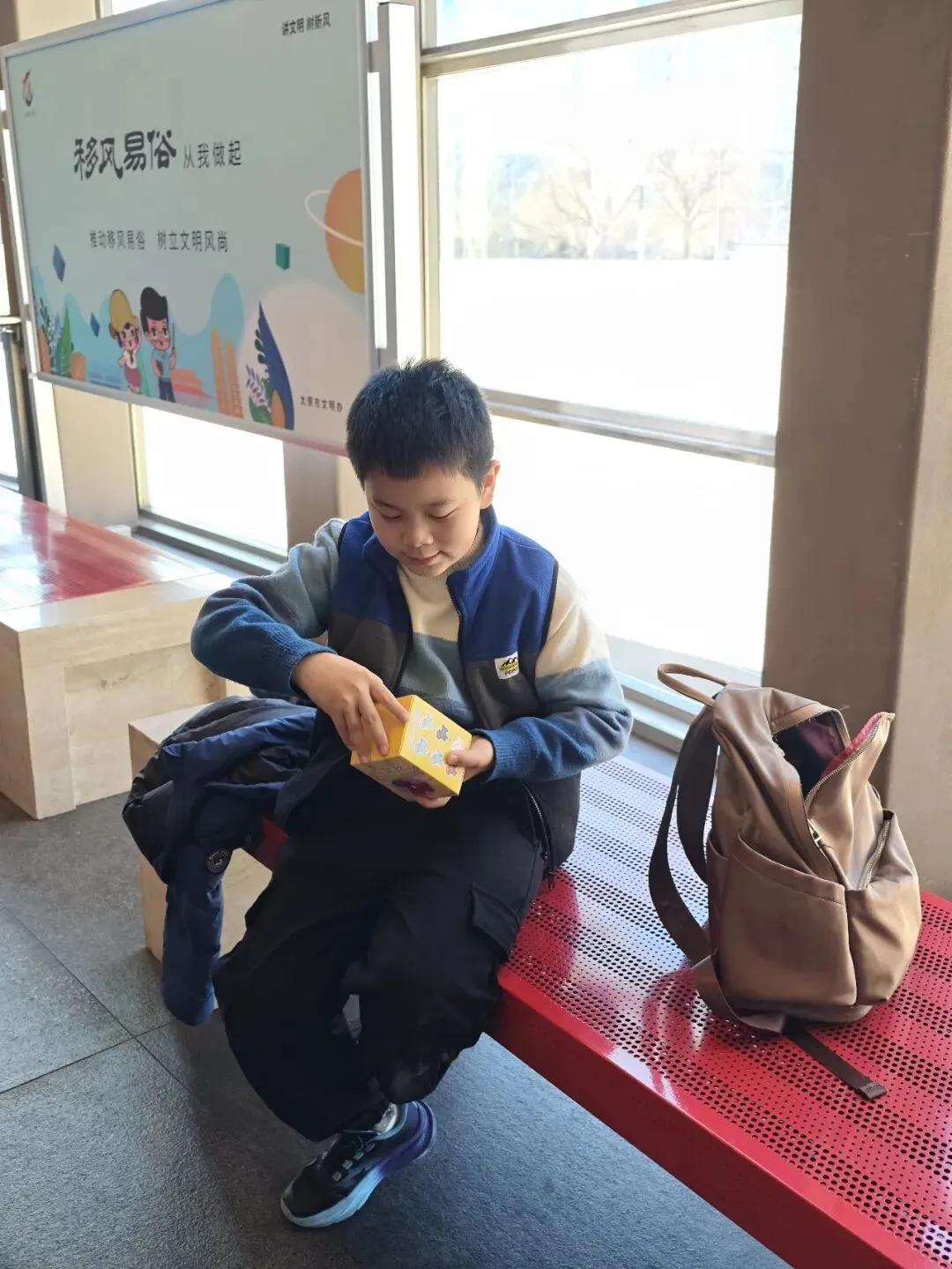 专程来看的雁鱼铜灯,这个在陕西省博物院也有一个差不多的,但是那个没有彩绘。鱼腹与雁颈为中空管道,灯盘燃烧产生的油烟会顺着管道进入雁腹,雁腹可盛水,油烟遇水溶解,实现烟尘净化,是世界最早的 “环保灯具” 之一。汉代铜灶。灶面开有一大两小三个火眼:大火眼上置大铜釜(主炊煮器),小火眼上置两个小铜釜(可温酒、热食或煮小份食物)。我俩逛完继续去文创店买买买,娃爸还在慢慢看,小朋友已经迫不及待拆盒了。也真的是非常冷,风也大,我们全副武装,继续去下一站。
