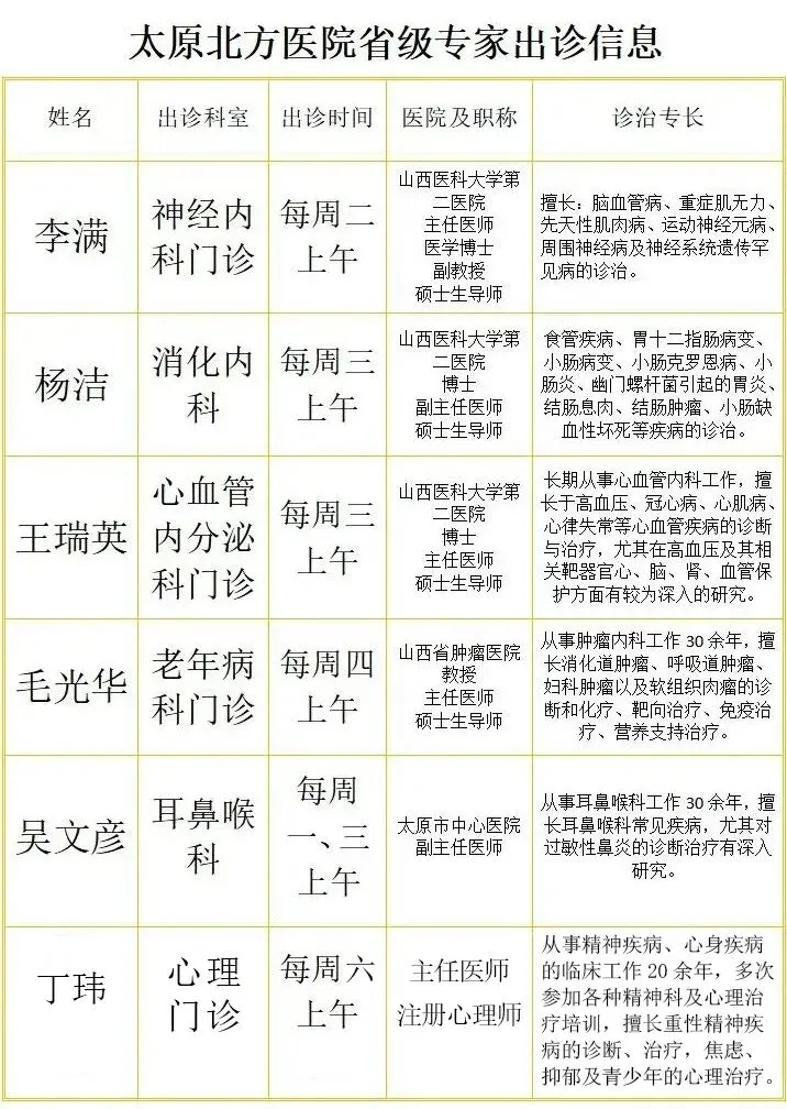 太原北方医院各科室省级专家出诊信息