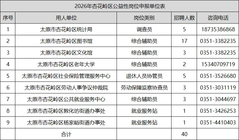 太原市杏花岭区招聘公益性岗位人员40人