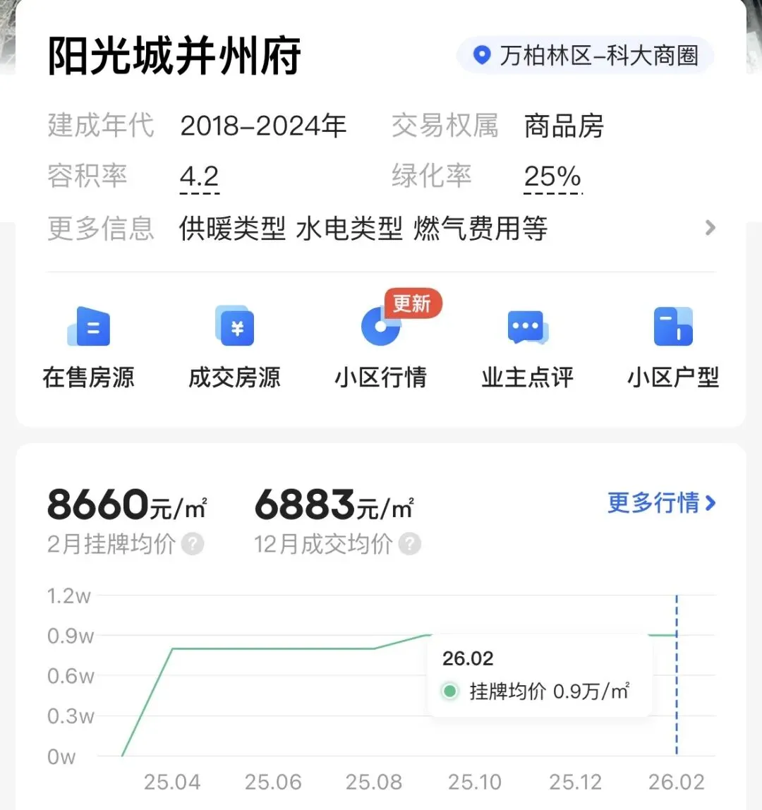 目前,贝壳找房上并州府二手房挂牌均价8660元/㎡,2025年12月成交均价仅6883元/㎡。