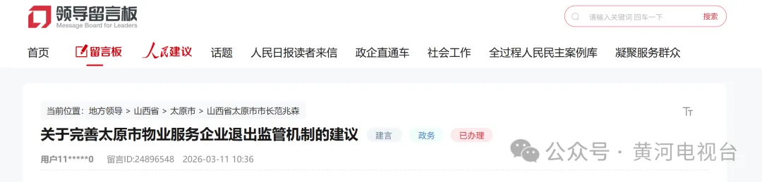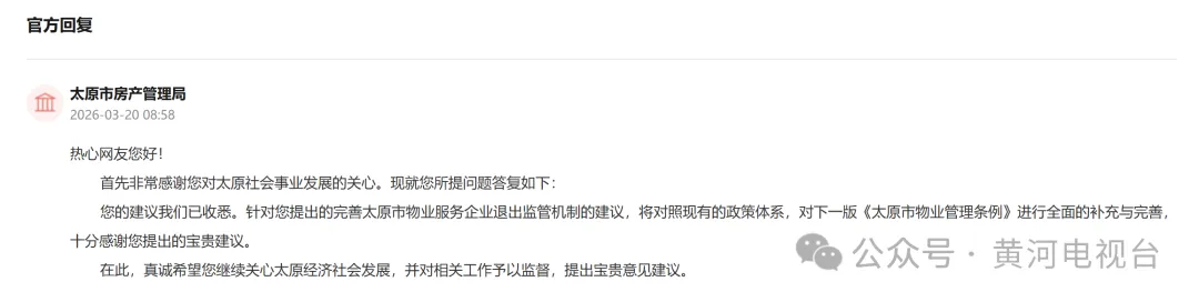 记者从人民网领导留言板获悉,网友提出关于太原市物业服务企业退出监管机制的建议: