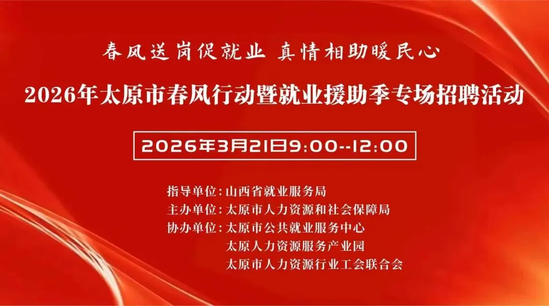 为全面落实稳就业、保就业工作部署,精准服务高校毕业生、农民工、就业困难人员等重点群体就业创业,太原市公共就业服务中心定于2026年3月21日,在太原人力资源服务产业园举办春风行动暨就业援助季专场招聘会,搭建企业与求职者高效对接平台,助力企业精准引才、劳动者安心择业。