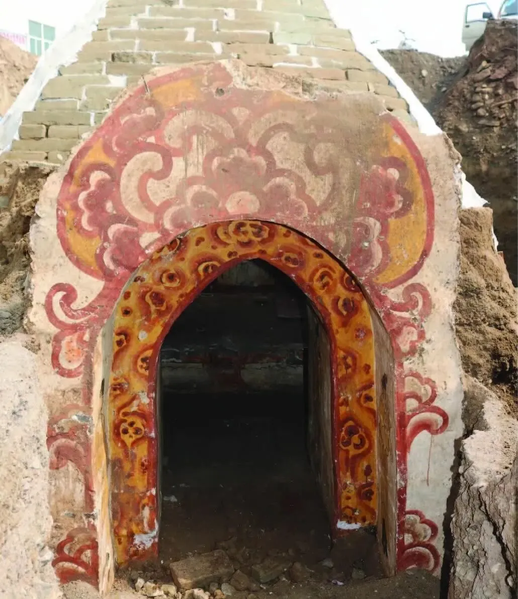 图里这个拱着的大门就是工人们挖出来的那个墓道口,砖砌拱门上头刷着一圈圈的大红花样,颜色还挺扎眼,远看像哪个庙门口的新漆活,泥土里头一下子冒出这一口,谁见了不得脱口一句“还以为是戏台子的大门呢”,细看砖缝,周围全是泥,还残着点白灰和雨水冲刷过的印,门槛底下踩着的地方已经踩实了,不知道多少年没人动过。