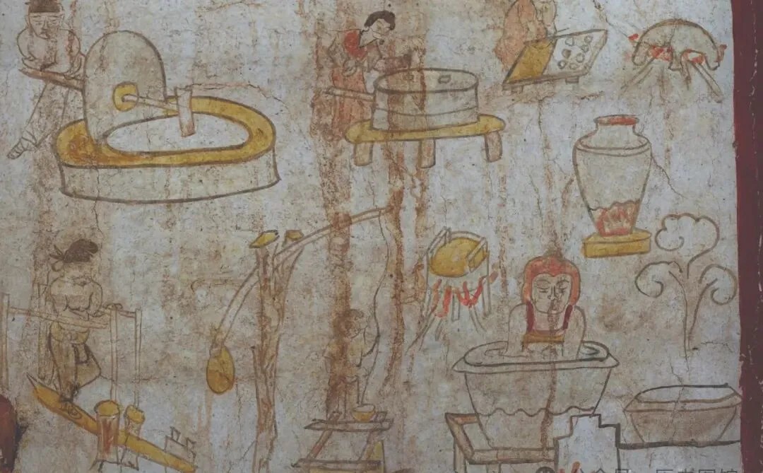 墙上除了那些穿黄衣服的大人物,还画了热气腾腾的日常营生,有人推石磨,有人在井边提水,做活的、抱孩子的,还有做面条的,男女老幼都在墙上一道过着小日子,有人问这么细的画是不是在显摆技术,我想还不是,就和家里老人把日常琐事一件件念叨一样,谁家不想留点自己的痕迹在后头,总归是那个年代最关键的照片墙。