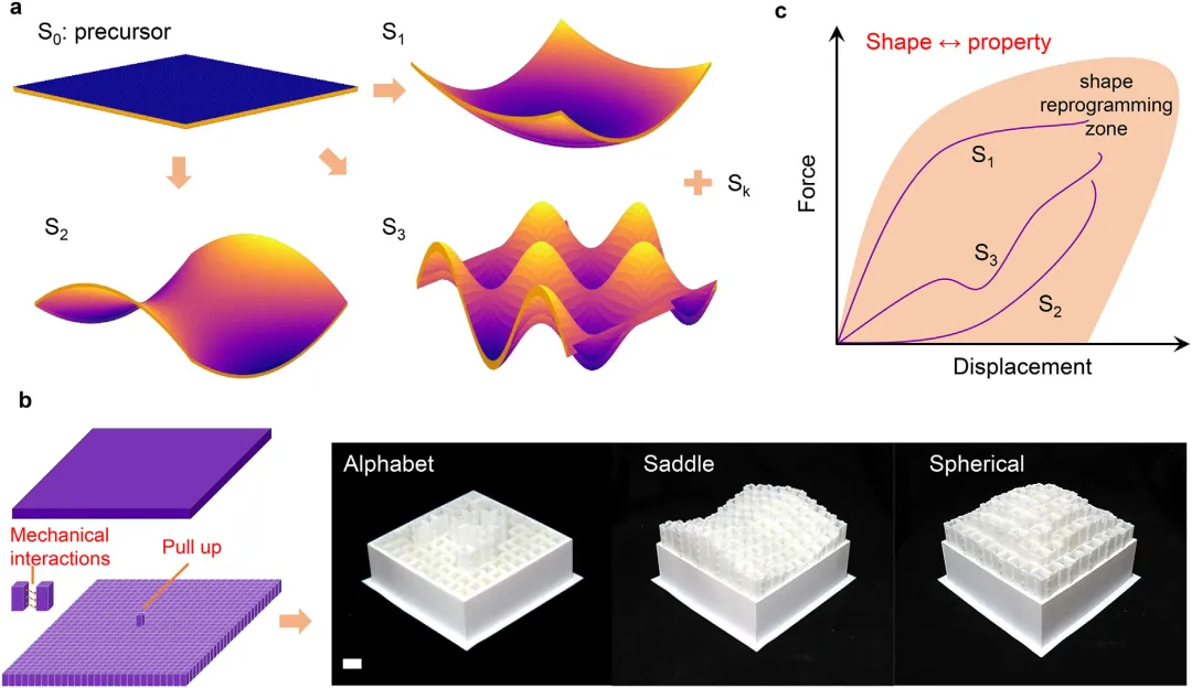 形状不仅是自然生物适应环境的关键手段,也是人工系统实现特定功能的底层蓝图。在机械超材料领域,形状变形能力为按需调控力学性能提供了可能。然而,现有研究大多局限于实现有限的形状变化或追求单一的性能目标,忽略了重构形状与力学响应之间的内在双向关联。其根本原因在于,缺乏能够将单一结构灵活、多样化地重编程为大量不同形状的设计策略,从而阻碍了形状-性能编码关系的系统性探究。针对这一空白,本研究提出了一种基于离散单元与摩擦互锁机制的新型机械超材料。不同于传统的连续连接方式,该设计使每个单元可独立调节,从而能将同一结构前体重构为任意数学曲面或复杂图案,并建立起每个形状与特定力学性能之间一一对应的“编码”关系。这一突破不仅为深入理解形状与性能的内在联系提供了理想平台,也为开发具有高度自适应性和可编程功能的智能结构开辟了新路径。一、解决的问题