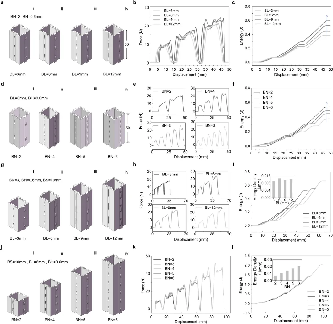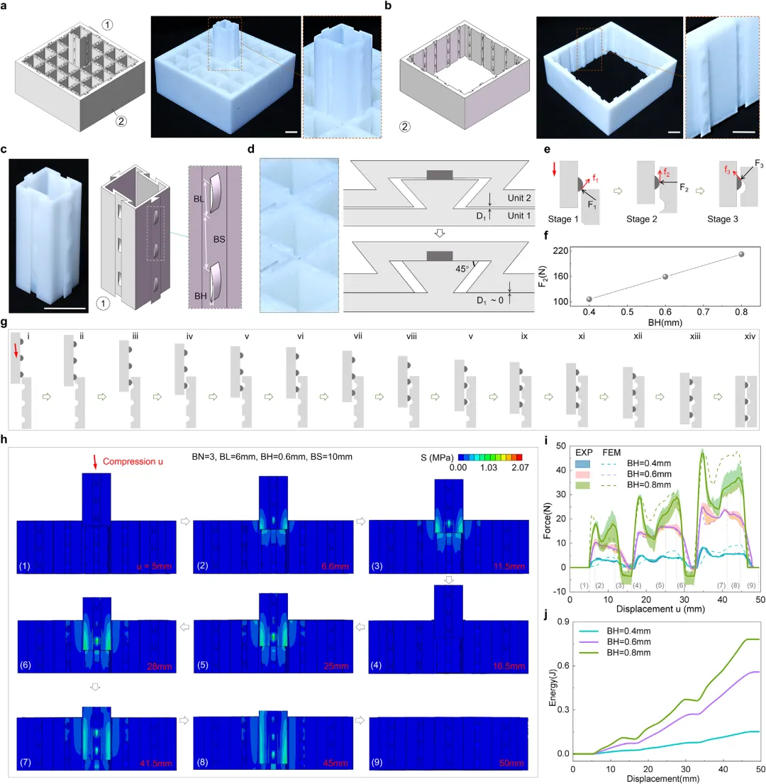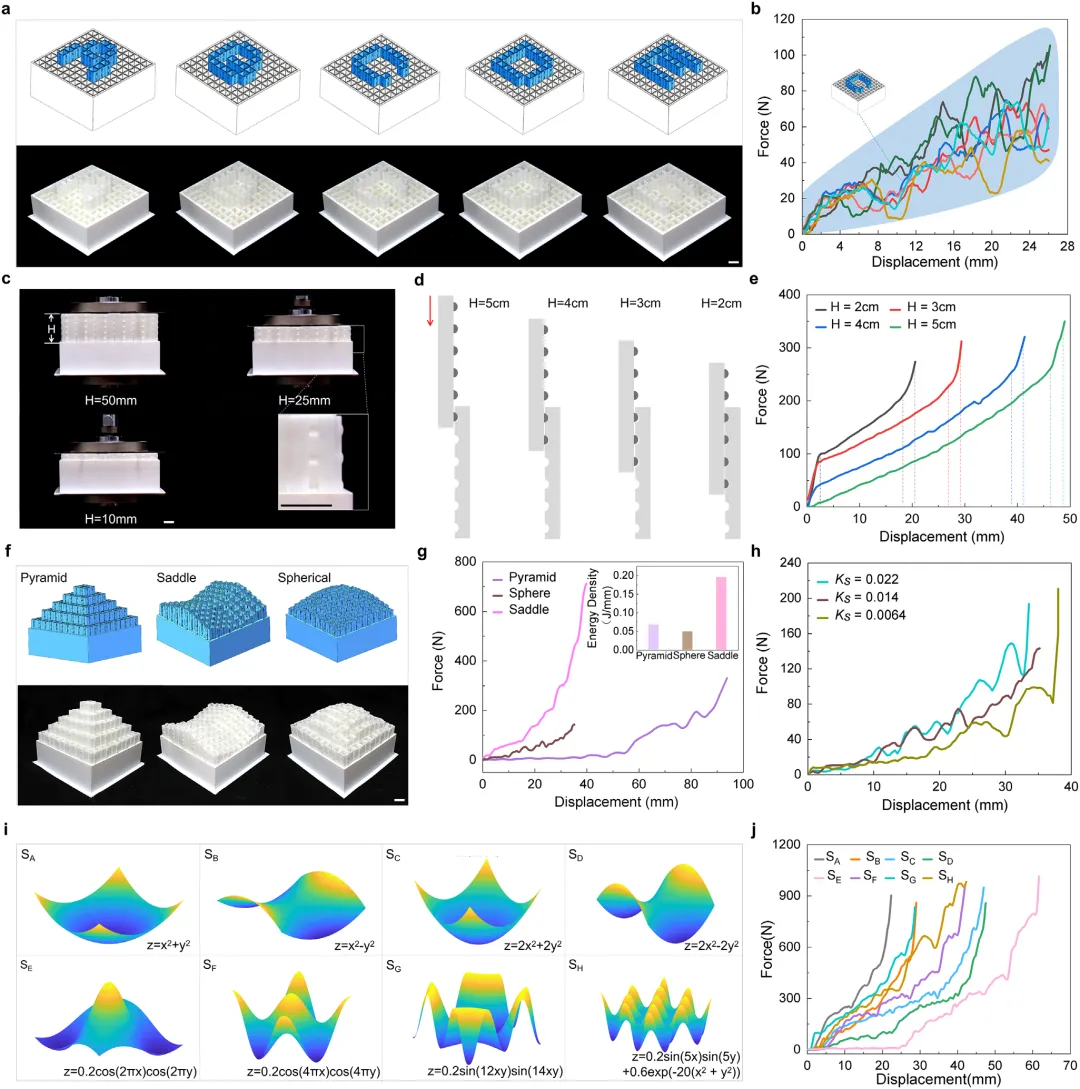 a) 系统可从单一前体结构(S₀)重编程为多种形状(Sₖ)。b) 结构由离散结构单元构成(左图),单元可独立调节高度,实现局部形状控制(左下)。代表性物理原型展示了零、正、负高斯曲率的形状(右图)。c) 提出的形状-性能编码框架,每个形状对应唯一的力学响应,可建立综合数据库。图2:所提出的形状变形机械超材料的构建及其重构机制与力学响应a) 可重编程形状变形结构的构建示意图,由离散结构单元通过摩擦和互锁的机械相互作用连接,并用边界框架约束。b) 基于5×5设计(单元尺寸2 cm × 2 cm)。c) 离散结构单元的结构设计细节,带有凹形凸起和凸形滑道。凸起由三个参数控制:凸起长度(BL)、凸起高度(BH)、凸起数量(BN)和凸起间距(BS)。d) 压缩过程中单元间凹凸结构部分的不相容和相容配合过程示意图。e) 相邻单元相互作用过程中的力学分量分析。f) 理论计算的接触力 F (N) 与 BH (mm) 的关系。g) 多凸起(图示为三个)相邻单元凹凸相互作用过程的示意图。h) BN = 3,BL = 6 mm,BH = 0.6 mm,BS = 10 mm 时相互作用过程的数值模拟细节。i) 通过比较仅改变 BH(BH = 0.4,0.6 和 0.8 mm)的三个不同单元,得到 (h) 中单轴压缩的力-位移曲线实验和数值结果。j) 根据 (i) 中实验计算的研究单元潜在吸收能量比较。比例尺:2 cm。a) 改变 BL(BL = 3,6,9,12 mm,BN = 3,BH = 0.6 mm)时,单轴压缩过程的力-位移曲线数值结果。b) 峰值力与 BL 的关系。c) 不同 BL 对应的吸收能量。d) 改变 BN(BN = 2,4,5,6,BL = 6 mm,BH = 0.6 mm)时,单轴压缩过程的力-位移曲线数值结果。e) 不同 BN 对应的峰值力。f) 不同 BN 对应的吸收能量。g) 改变 BS(BS = 6,10,14 mm,BL = 6 mm,BN = 3,BH = 0.6 mm)时,单轴压缩过程的力-位移曲线数值结果。h) 峰值力与 BS 的关系。i) 不同 BS 对应的吸收能量。j) 改变 BH(BH = 0.4,0.6,0.8 mm,BL = 6 mm,BN = 3,BS = 10 mm)时,单轴压缩过程的力-位移曲线数值结果。k) 峰值力与 BH 的关系。l) 不同 BH 对应的吸收能量。比例尺:2 cm。图4:所提出的形状变形机械超材料形状与性能编码关联的演示