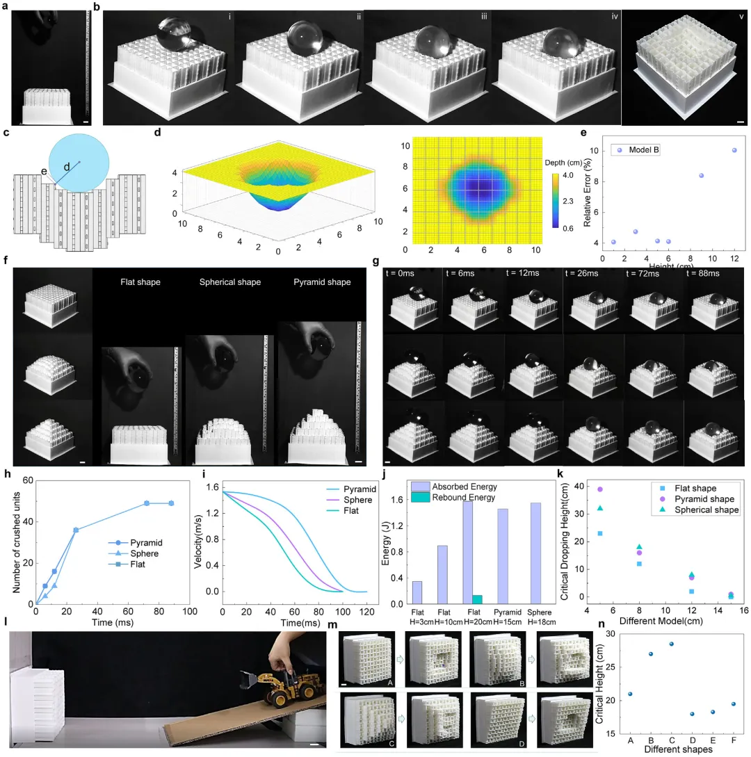 自适应与可调吸能机制的集成:将形状可重构性与能量吸收功能深度耦合,实现了防护结构在遭遇未知形状冲击物时能被动自适应贴合,并能根据需求主动预编程为不同的吸能模式,克服了传统吸能材料功能单一的局限。