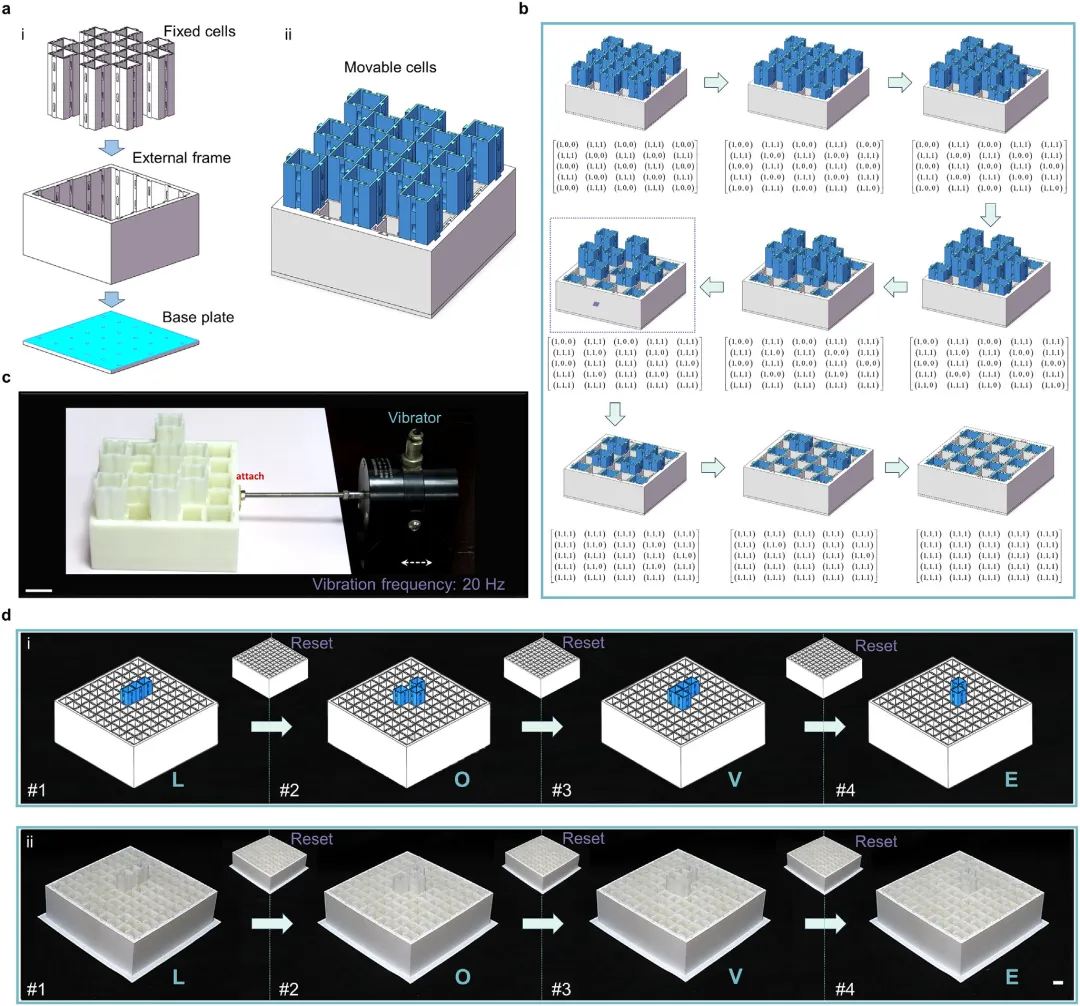 所有演示均基于 10×10 原型。a, b) 结构形状重编程特性(a)及其单轴压缩力-位移曲线结果(b)的示意图和实验演示。c-e) 通过拉伸不同高度 H 的单元形成平面形状,演示形状-性能编码关联(c)。该过程通过同时压缩所有结构单元实现,相互作用主要发生在边界框架及其接触单元之间。研究了四种不同平面形状,H = 2,3 cm,4 和 5 cm(d)。所有形状均呈现多段强化力-位移曲线(e)。f-h) 通过具有零(金字塔)、负(马鞍)和正(球冠)高斯曲率的曲面形状(f)演示形状-性能编码关联,它们均表现出独特的力-位移曲线(g,h)。i, j) 通过数学定义的形状(i)演示形状-性能编码关联,每种形状均表现出独特的力-位移曲线(j)。比例尺:2 cm。所有演示均基于 10×10 原型。a-d) 通过在平面形状上落下玻璃球(直径 = 80 mm)演示自适应能量吸收行为(a)。用高速相机捕捉下落过程,见图 b 中 i-iv(b)。平面形状最终变形并形成近似球形(图 b 中 v),通过实验测量每个重构结构单元的压缩深度进行拟合(c,d)。形成的形状轮廓非常接近冲击球的底部结构包络线,平均误差约为 6%(e)。f) 通过将玻璃球冲击不同的平面、球面和金字塔形状,演示可调能量吸收性能(f)。g) 高速相机捕捉的三种形状冲击过程图像(f)。h) 三种形状在冲击过程中压溃单元数量随时间的变化。i) 冲击三种重构形状顶面后,下落球的速度变化。j) 测试的不同形状的冲击吸收能量。k) 通过监测平面、球面和金字塔形状上玻璃球不反弹的临界下落距离,探索能量吸收能力。测试了不同直径的球(5,8,12,15 cm)。l-n) 通过让挖掘机玩具车撞击结构上(m)一种独特的重构形状,展示其作为碰撞缓冲结构的潜力,该结构具有可调的临界撞击高度(n)。比例尺:2 cm。图6:作为机械存储器和可刷新盲文触觉显示设备的多功能演示所有演示均基于 10×10 原型。a-c) 作为机械存储器设备的应用演示(a),通过使用离散结构单元作为像素,可重编程存储更多信息。由于凸起互锁实现的单元多稳定性(b)以及抵抗外部干扰(如机械振动)的坚固结构稳定性(c),其信息密度高。d) 通过重置和重新配置结构单元在字母 L,O,V,E 之间切换,展示其作为可刷新盲文触觉显示设备的示意图和实验演示。比例尺:2 cm。DOI:https://doi.org/10.1002/adfm.75001