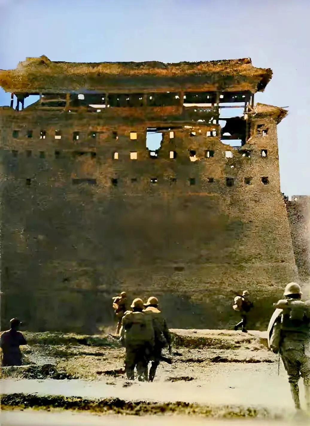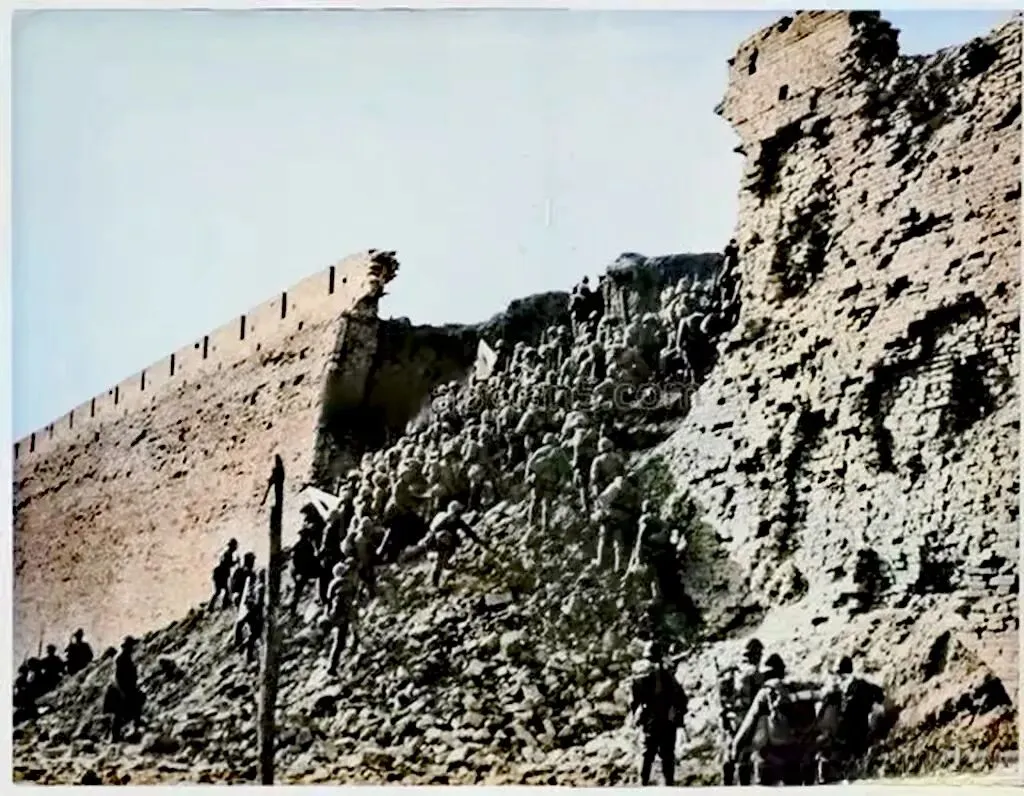 1937年11月8日,从太原城东南侧箭楼向城内进攻的侵华日军大场部队。太原古城曾经雄伟的城门楼,在日军炮火轰炸后残破不堪。