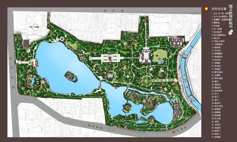 古建群与园林:迎泽公园堪称北方古建的实物博物馆。园内亭台楼阁、廊桥坊榭应有尽有,且多仿自全国名建筑。北门牌楼仿北京雍和宫牌楼,园内长廊仿北京颐和园长廊,望景楼廊桥则借鉴了苏州拙政园的意境 。公园里的亭子样式繁多,有三角亭、四角亭、六角亭、八角亭、扇面亭、海棠亭等,一亭一式,妙趣横生 。此外,从太原城内清代别墅迁移而来的 绿绣亭 也是园中珍奇古建。