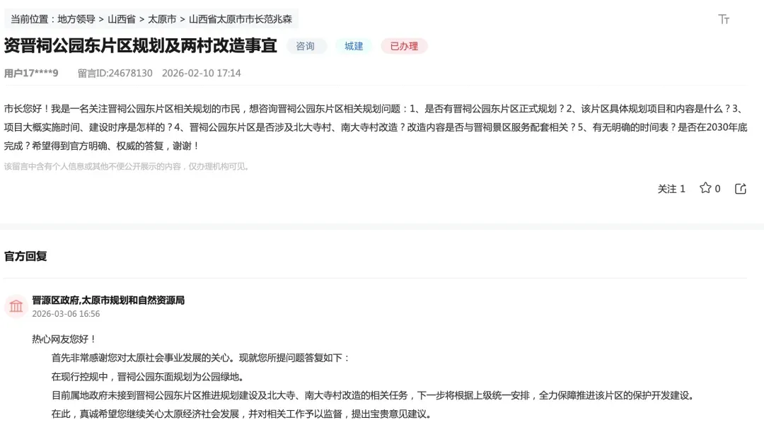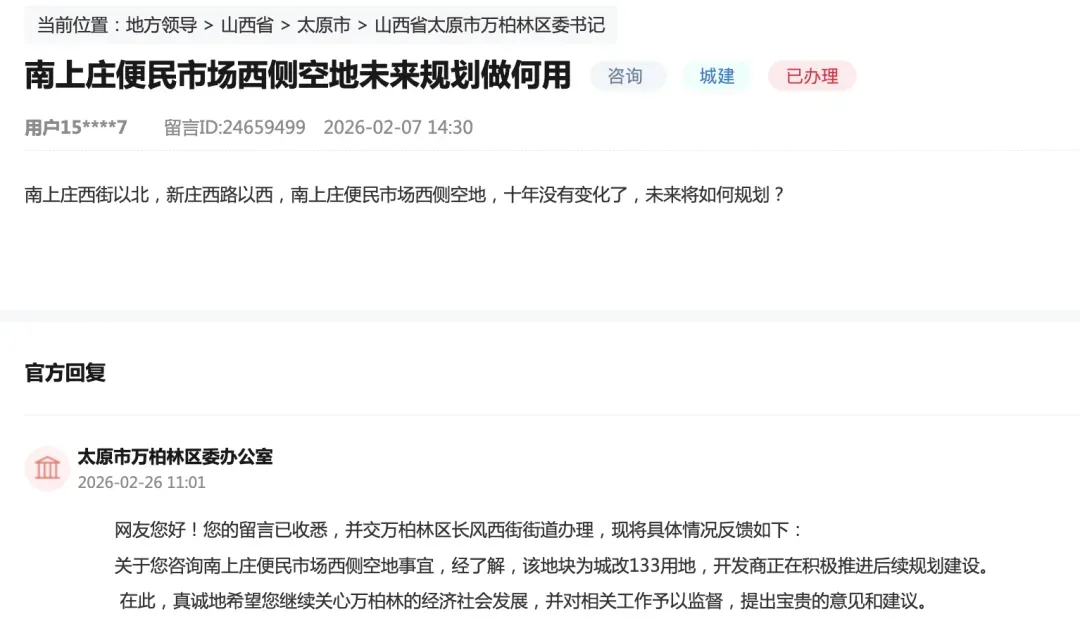 近日,有市民咨询:晋祠公园东片区规划及两村改造事宜。目前属地政府未接到晋祠公园东片区推进规划建设及北大寺、南大寺村改造的相关任务,下一步将根据上级统一安排,全力保障推进该片区的保护开发建设。近日,有市民咨询:南上庄便民市场西侧空地未来规划做何用?关于您咨询南上庄便民市场西侧空地事宜,经了解,该地块为城改133用地,开发商正在积极推进后续规划建设。南上庄二期回迁仍有缺口,结合片区规划:上述133用地一定概率用于回迁住宅、社区商业或配套公建;或是补充片区生活服务,与现有便民市场联动。