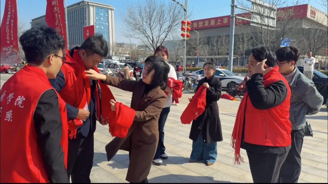 活动现场,郭建秀老师亲自为音乐系党员师生与入党积极分子佩戴红围巾、整理志愿者马甲,温情满满。学子们身着红装、精神昂扬,以饱满热情投入到各项工作中。暖阳映照下,大家分工协作、默契配合,用青春力量护航民俗盛会,充分彰显了党员的先锋模范作用,展现出青年学子勇担使命、昂扬向上的精神风貌。