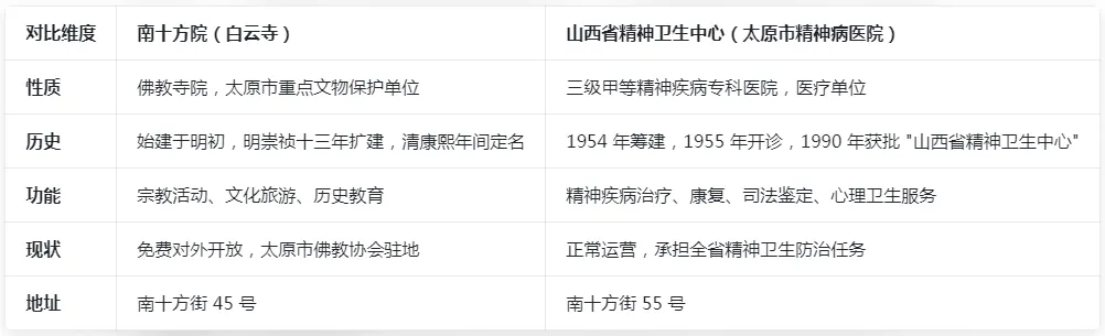 但令人遗憾的是,对于普通市民来说,提起南十方,想到的却不是白云寺,而是精神病院,并形成了太原独特的文化梗。多数太原人对南十方的第一认知,源于民间玩笑式的代称,而非古寺本身。