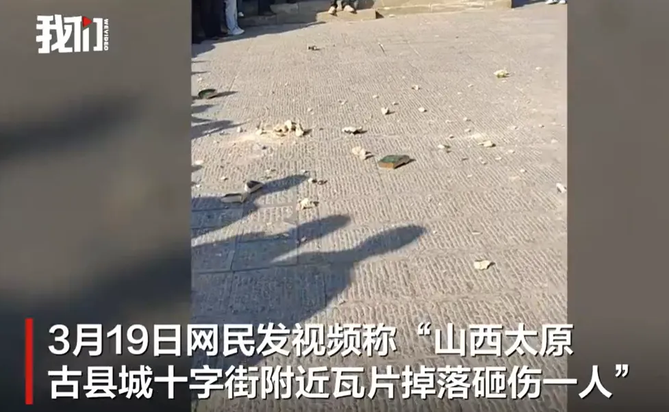 3月19日,网民发视频称“山西太原古县城十字街附近瓦片掉落砸伤一人”。3月20日,太原古县城游客服务中心称,该景区工作人员已陪护伤者就医,事发地周围已警戒。