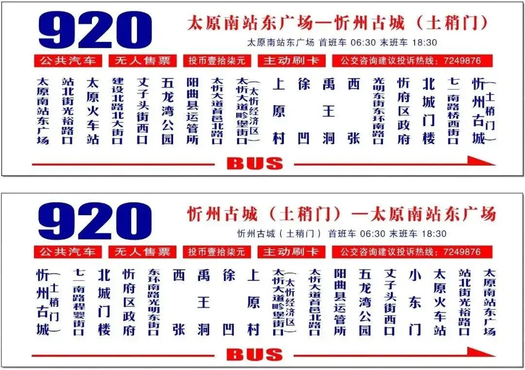 为了进一步方便920路【太原南站东广场-忻州古城(土稍门)】沿线市民往返太原、忻州两地,从2026年3月21日起,920路沿途增加:建设北路北大街口(回程为小东门)、丈子头街西口、五龙湾公园、太忻大道首邑北路口、上原村、七一南路桥西街口(回程为七一南路程婴街口)公交站点停靠。
