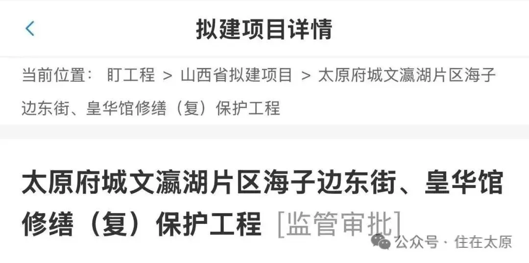 太原府城文瀛湖片区海子边东街,皇华馆修缮(复) 保护工程由太原市迎泽资产经营管理有限公司开发建设,总投资12亿元。