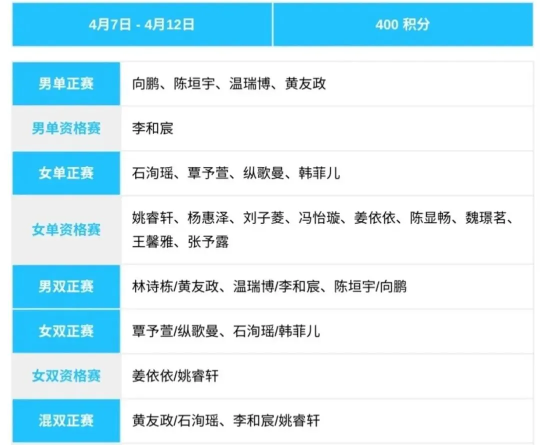 最狠的是,教练组给其中六个人下达了“极限任务”:温瑞博、黄友政、李和宸、石洵瑶、纵歌曼、姚睿轩,全部身兼单打、双打、混双三项。 这意味着从4月7日开赛到12日结束,他们几乎每天都要在不同项目间连轴转。 这根本不是普通的练兵,而是一场对体能、精力和战术切换能力的“压力测试”。