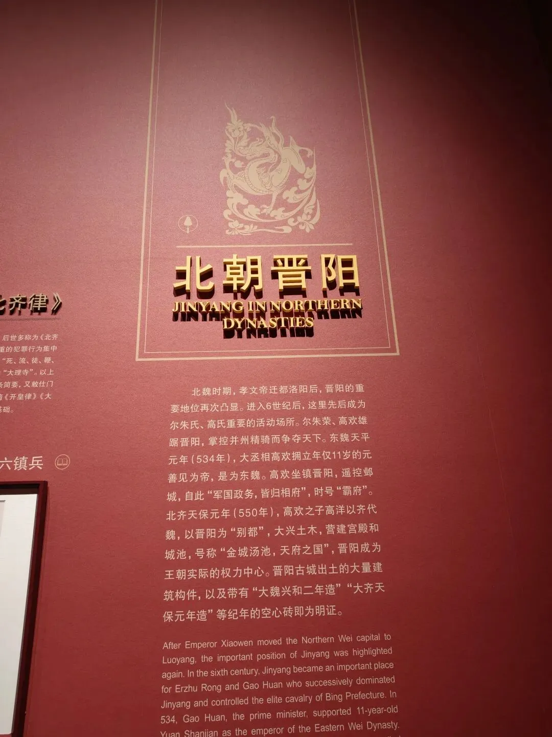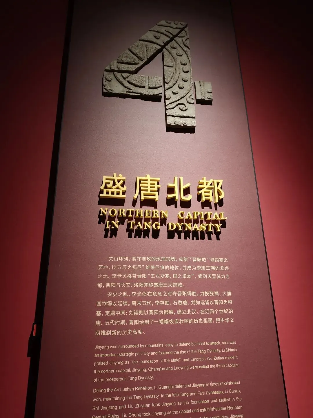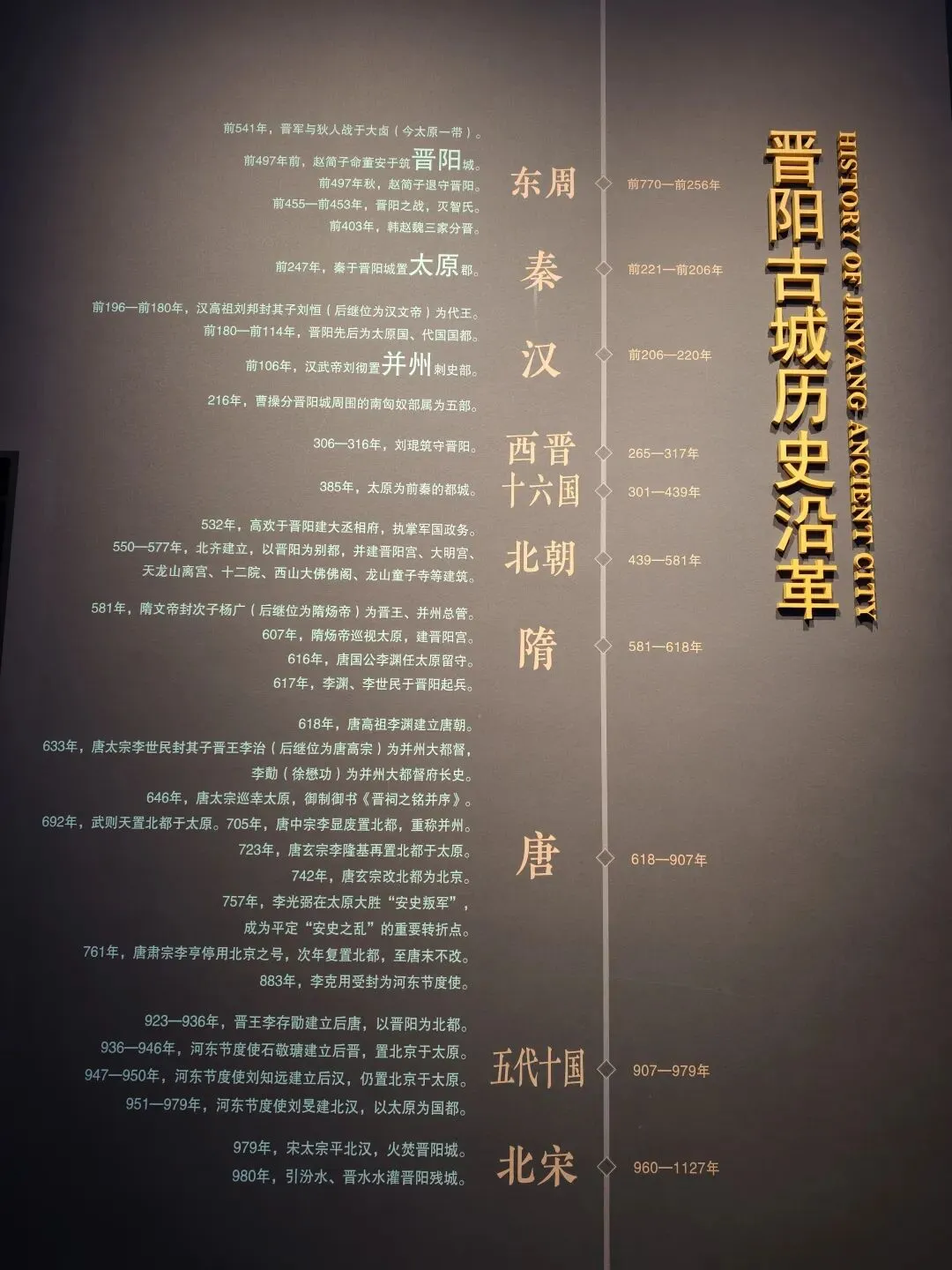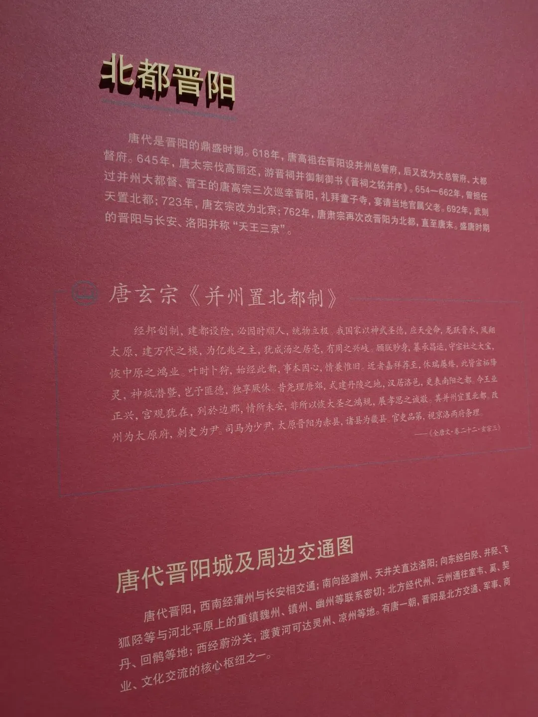 开在城墙里的晋阳古城考古博物馆。这块残碑上最著名的四个字“晋阳雄異”(異即异)透露出晋阳非同一般的历史。晋阳古城的历史沿革,从春秋建城到北宋时毁历经约两千年。晋阳的“晋”源自春秋时的晋国,也变成了如今山西的简称。不过这块大地最早的政权是商周时的古唐国。后来西周分封的唐叔虞也是周成王的弟弟,这关系算比较亲的了。分封的背景还有一段被误传的典故“剪桐封弟”好有意思。晋阳第一次面临战火是在春秋进入战国时三家分晋战役之一的晋阳之战。强大的晋国就在韩赵魏联合攻灭下进入了“三晋”时代。如果古代的臣子都能有这种觉悟,何尝不会成就一代伟大的统治。进入魏晋南北朝后,北方战乱不断,晋阳作为兵家必争之地,屡遭战火但依旧坚固。闻鸡起舞的另一位主角,并州刺史刘琨也是祖逖的好朋友,两人都有北伐之志。进入北朝,特别是孝文帝迁都洛阳后,晋阳的战略位置又得到了提高。北齐时形成了“邺-晋阳”两都制,尚书省也分俩,确实是一种分割相权的好方法。进入大唐后,作为北都的晋阳的地位再次提升,与长安、洛阳并称盛唐三大都城。太原最出名的称号就是龙兴之地,李渊建立大唐就是从太原起兵的。因此太原的地位在唐朝至关重要,成为其北都,与长安、洛阳并称“天王三京”。介绍了唐朝五座比较宏伟的城建,长安和洛阳果然是最大的两座。没时间去晋祠了,在博物馆里看到了一件来自于晋祠的石碑,唐太宗为唐叔虞歌功颂德的石碑,还是现存最早的行书碑。协助郭子仪平定安史之乱的李光弼就是在三都中洛阳和长安沦陷后死守晋阳,赢得了安史之乱中的第一场胜战。每次看到墓志铭上的石碑刻字都觉得青史留名对古人的重要性。五代十国的都城中有不少把陪都选在太原,也包括以太原为都的北汉。