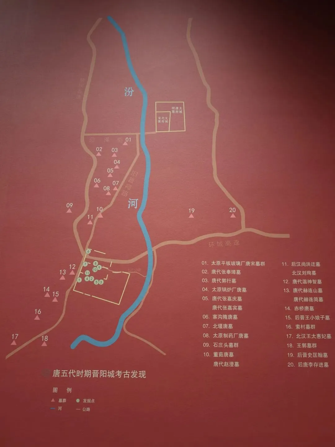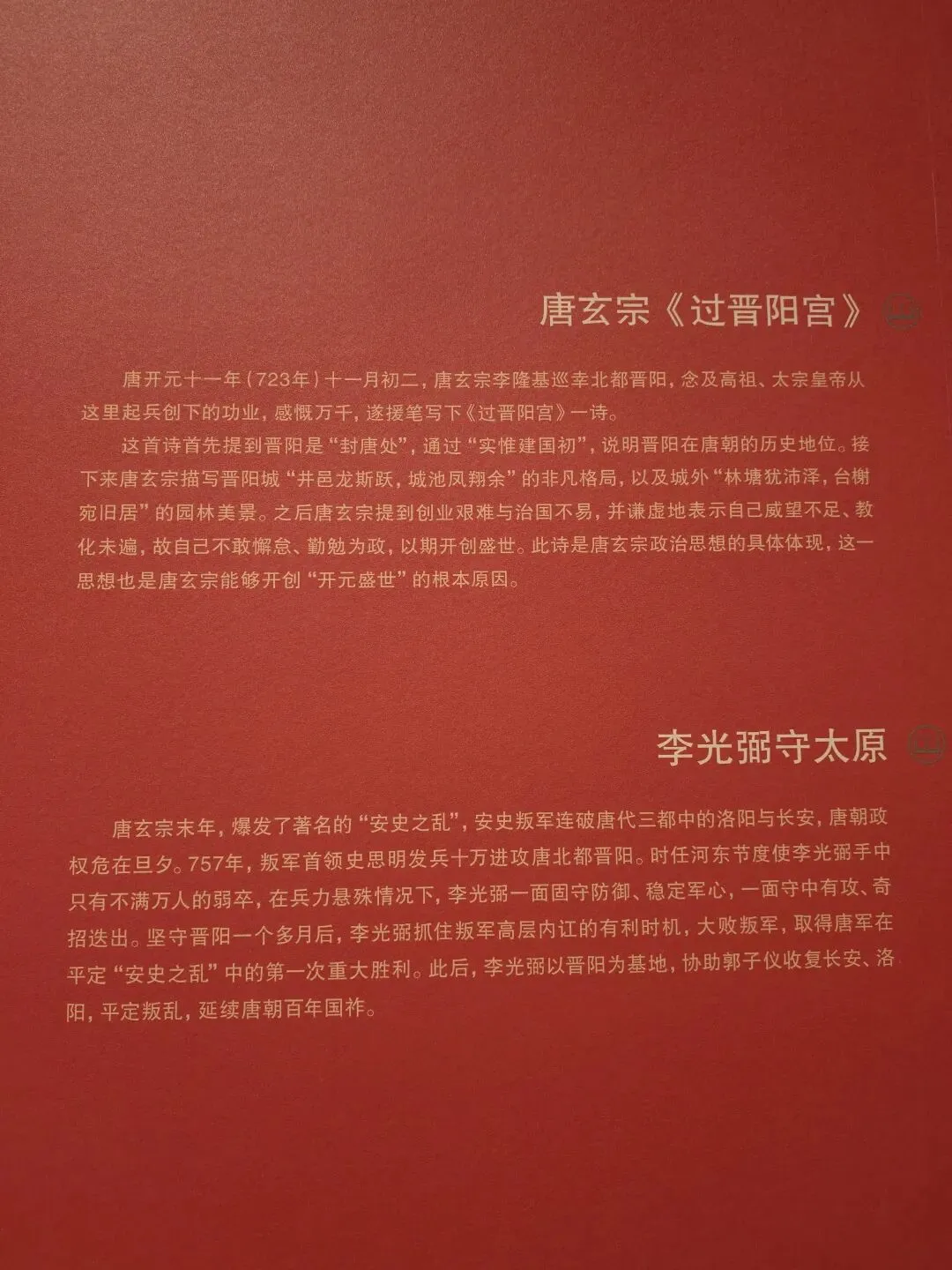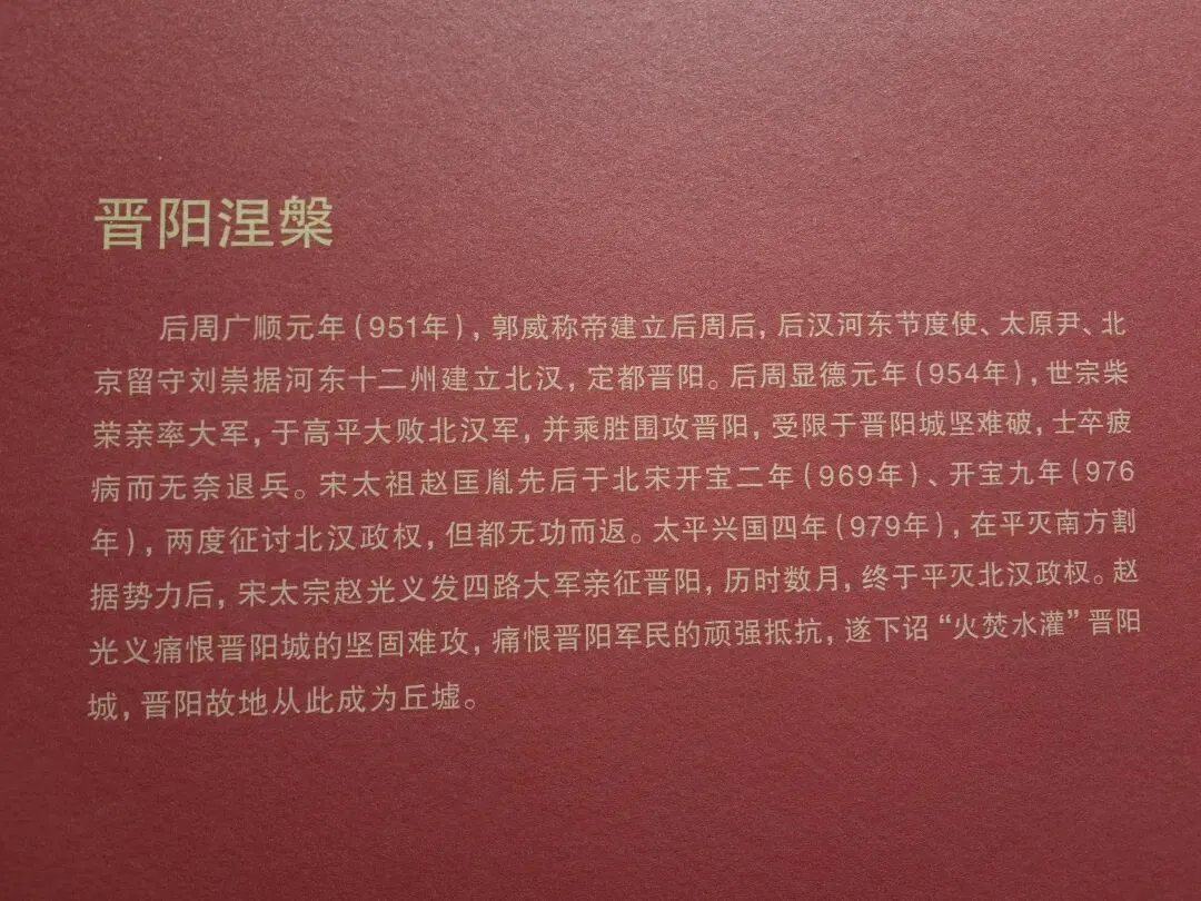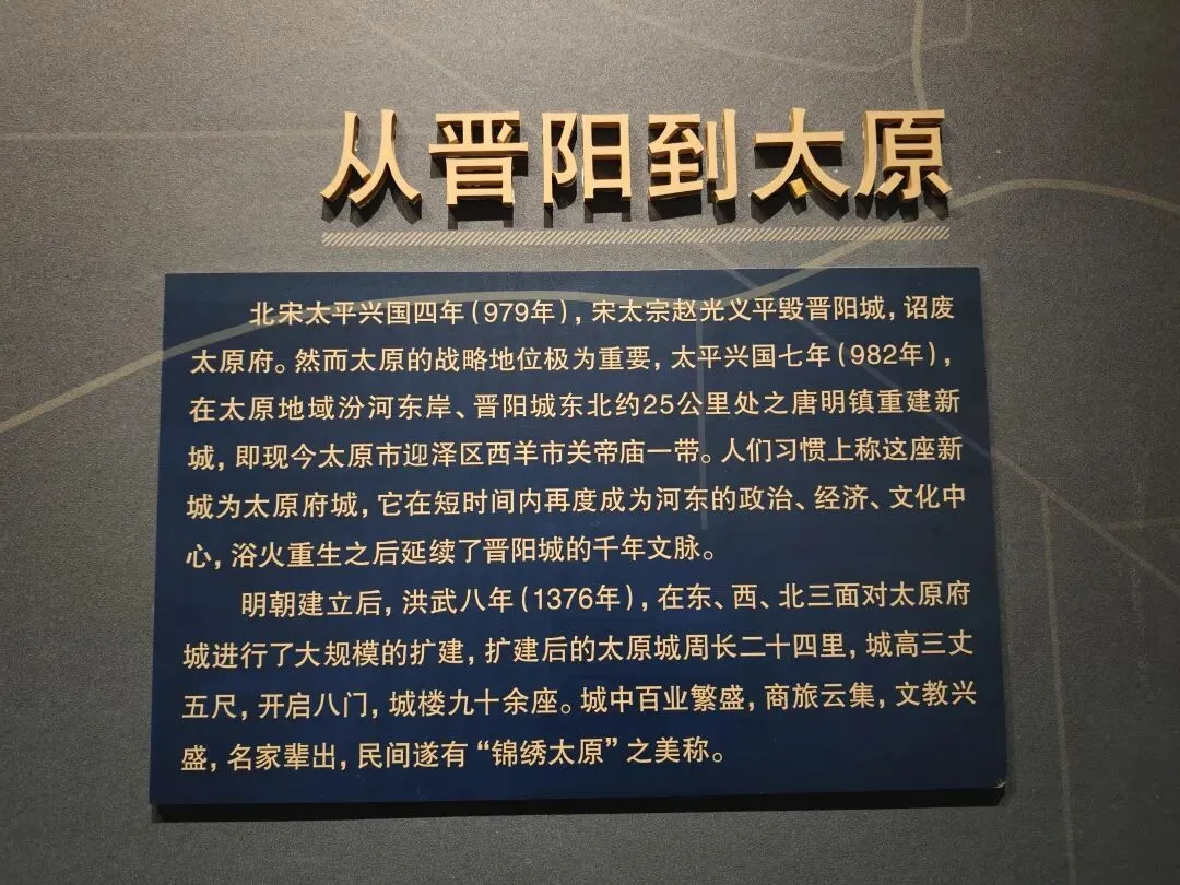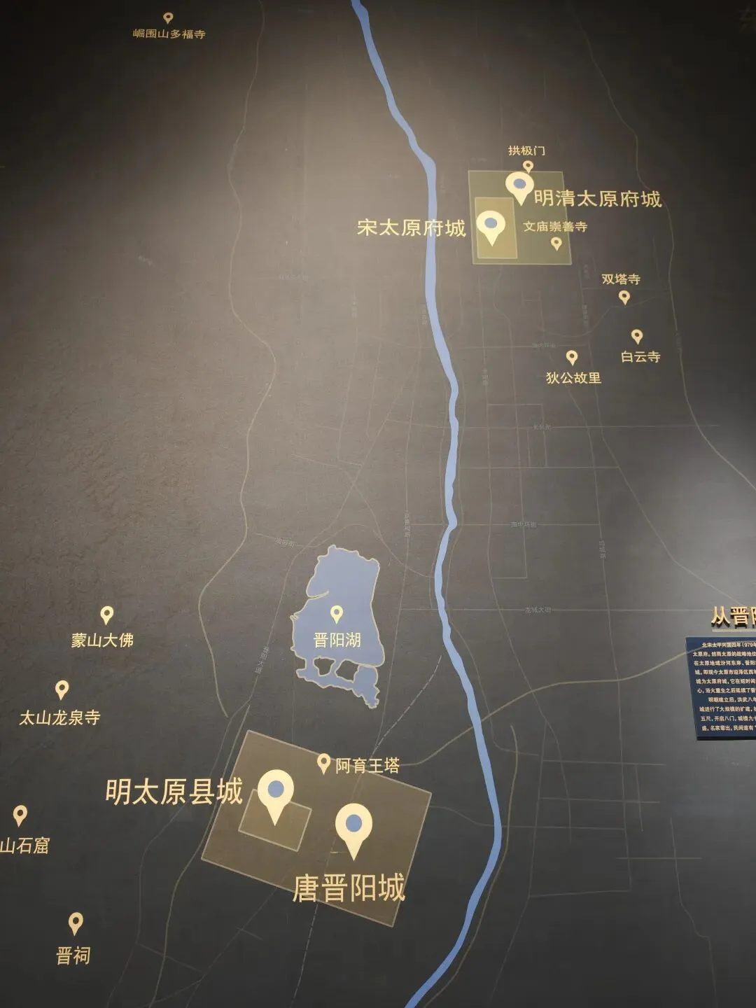 开在城墙里的晋阳古城考古博物馆。这块残碑上最著名的四个字“晋阳雄異”(異即异)透露出晋阳非同一般的历史。晋阳古城的历史沿革,从春秋建城到北宋时毁历经约两千年。晋阳的“晋”源自春秋时的晋国,也变成了如今山西的简称。不过这块大地最早的政权是商周时的古唐国。后来西周分封的唐叔虞也是周成王的弟弟,这关系算比较亲的了。分封的背景还有一段被误传的典故“剪桐封弟”好有意思。晋阳第一次面临战火是在春秋进入战国时三家分晋战役之一的晋阳之战。强大的晋国就在韩赵魏联合攻灭下进入了“三晋”时代。如果古代的臣子都能有这种觉悟,何尝不会成就一代伟大的统治。进入魏晋南北朝后,北方战乱不断,晋阳作为兵家必争之地,屡遭战火但依旧坚固。闻鸡起舞的另一位主角,并州刺史刘琨也是祖逖的好朋友,两人都有北伐之志。进入北朝,特别是孝文帝迁都洛阳后,晋阳的战略位置又得到了提高。北齐时形成了“邺-晋阳”两都制,尚书省也分俩,确实是一种分割相权的好方法。进入大唐后,作为北都的晋阳的地位再次提升,与长安、洛阳并称盛唐三大都城。太原最出名的称号就是龙兴之地,李渊建立大唐就是从太原起兵的。因此太原的地位在唐朝至关重要,成为其北都,与长安、洛阳并称“天王三京”。介绍了唐朝五座比较宏伟的城建,长安和洛阳果然是最大的两座。没时间去晋祠了,在博物馆里看到了一件来自于晋祠的石碑,唐太宗为唐叔虞歌功颂德的石碑,还是现存最早的行书碑。协助郭子仪平定安史之乱的李光弼就是在三都中洛阳和长安沦陷后死守晋阳,赢得了安史之乱中的第一场胜战。每次看到墓志铭上的石碑刻字都觉得青史留名对古人的重要性。五代十国的都城中有不少把陪都选在太原,也包括以太原为都的北汉。
