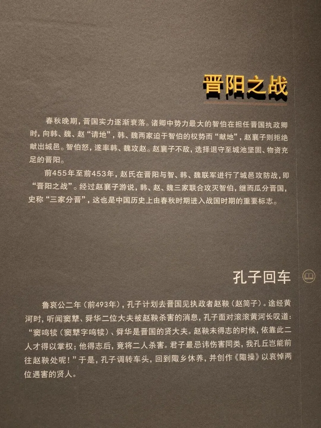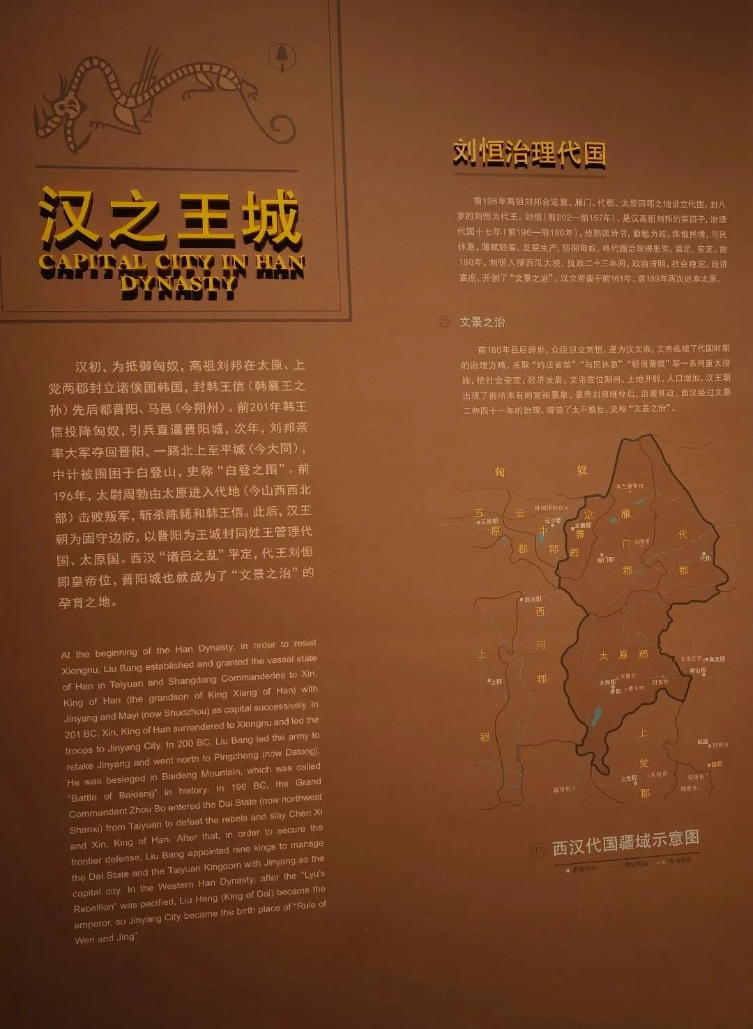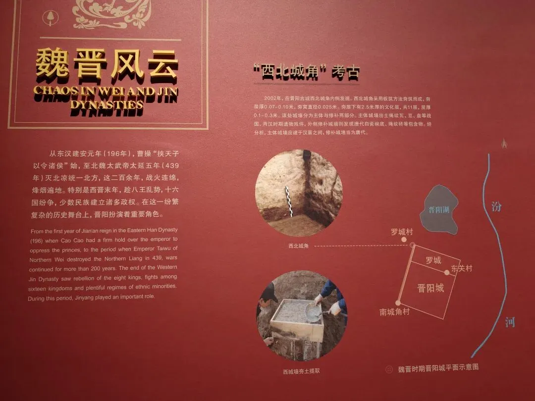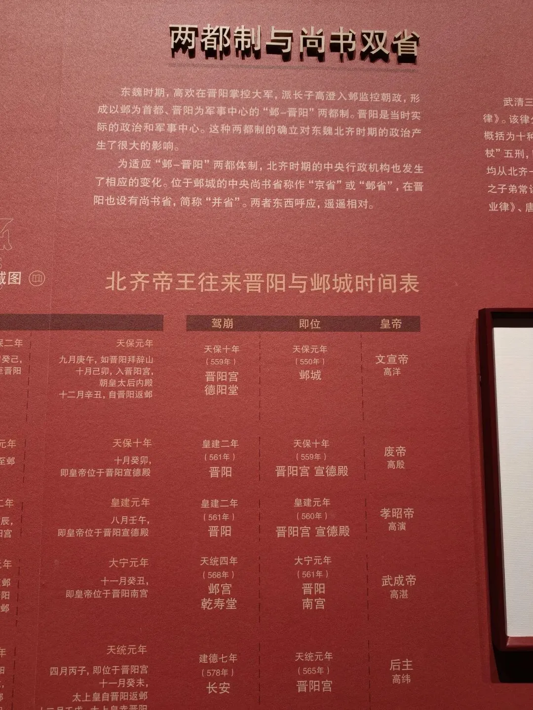 开在城墙里的晋阳古城考古博物馆。这块残碑上最著名的四个字“晋阳雄異”(異即异)透露出晋阳非同一般的历史。晋阳古城的历史沿革,从春秋建城到北宋时毁历经约两千年。晋阳的“晋”源自春秋时的晋国,也变成了如今山西的简称。不过这块大地最早的政权是商周时的古唐国。后来西周分封的唐叔虞也是周成王的弟弟,这关系算比较亲的了。分封的背景还有一段被误传的典故“剪桐封弟”好有意思。晋阳第一次面临战火是在春秋进入战国时三家分晋战役之一的晋阳之战。强大的晋国就在韩赵魏联合攻灭下进入了“三晋”时代。如果古代的臣子都能有这种觉悟,何尝不会成就一代伟大的统治。进入魏晋南北朝后,北方战乱不断,晋阳作为兵家必争之地,屡遭战火但依旧坚固。闻鸡起舞的另一位主角,并州刺史刘琨也是祖逖的好朋友,两人都有北伐之志。进入北朝,特别是孝文帝迁都洛阳后,晋阳的战略位置又得到了提高。北齐时形成了“邺-晋阳”两都制,尚书省也分俩,确实是一种分割相权的好方法。进入大唐后,作为北都的晋阳的地位再次提升,与长安、洛阳并称盛唐三大都城。太原最出名的称号就是龙兴之地,李渊建立大唐就是从太原起兵的。因此太原的地位在唐朝至关重要,成为其北都,与长安、洛阳并称“天王三京”。介绍了唐朝五座比较宏伟的城建,长安和洛阳果然是最大的两座。没时间去晋祠了,在博物馆里看到了一件来自于晋祠的石碑,唐太宗为唐叔虞歌功颂德的石碑,还是现存最早的行书碑。协助郭子仪平定安史之乱的李光弼就是在三都中洛阳和长安沦陷后死守晋阳,赢得了安史之乱中的第一场胜战。每次看到墓志铭上的石碑刻字都觉得青史留名对古人的重要性。五代十国的都城中有不少把陪都选在太原,也包括以太原为都的北汉。