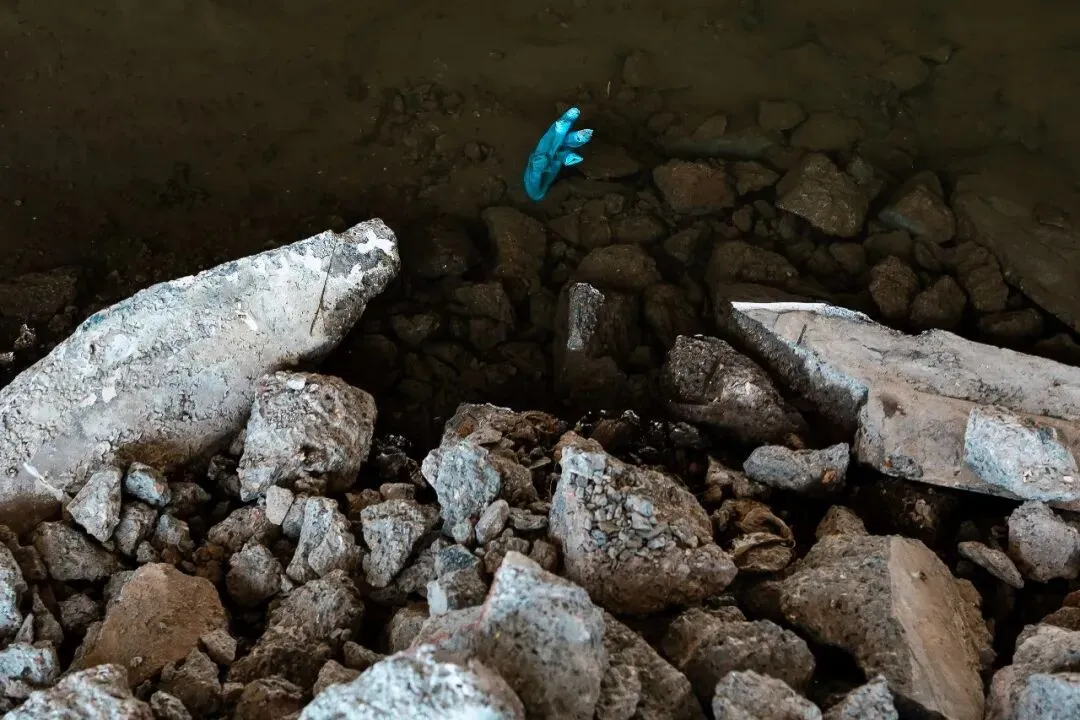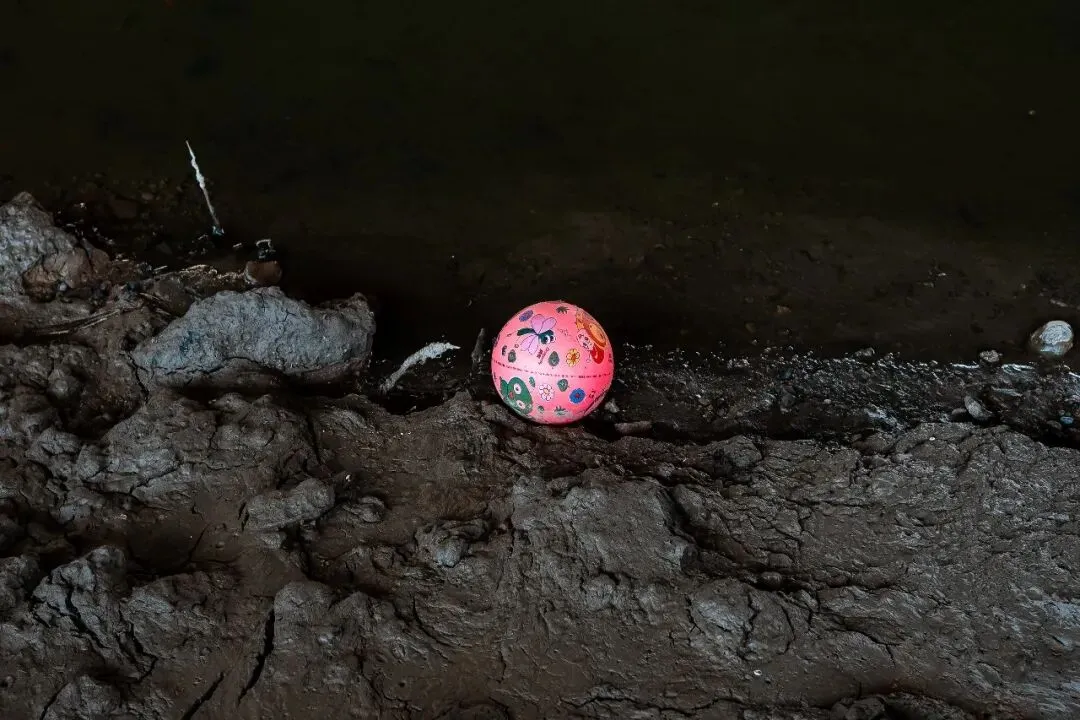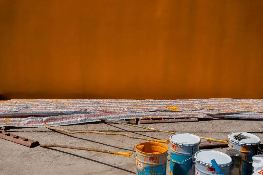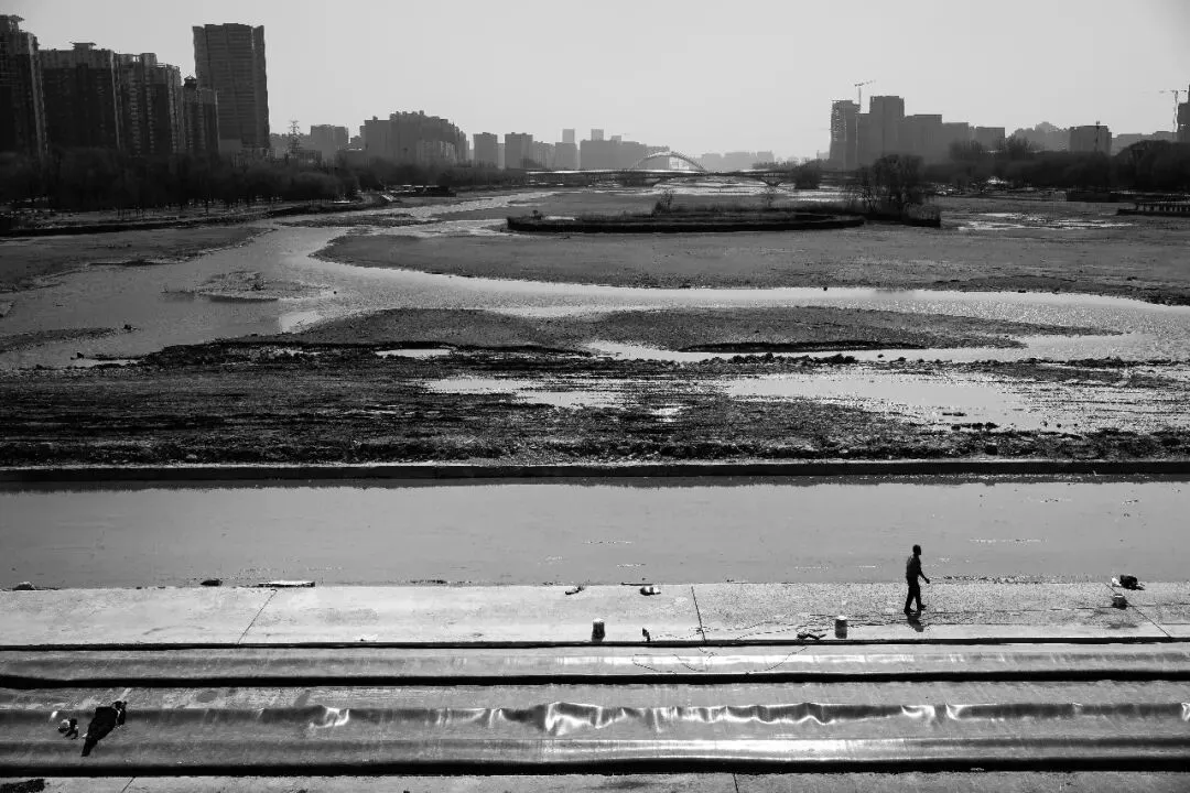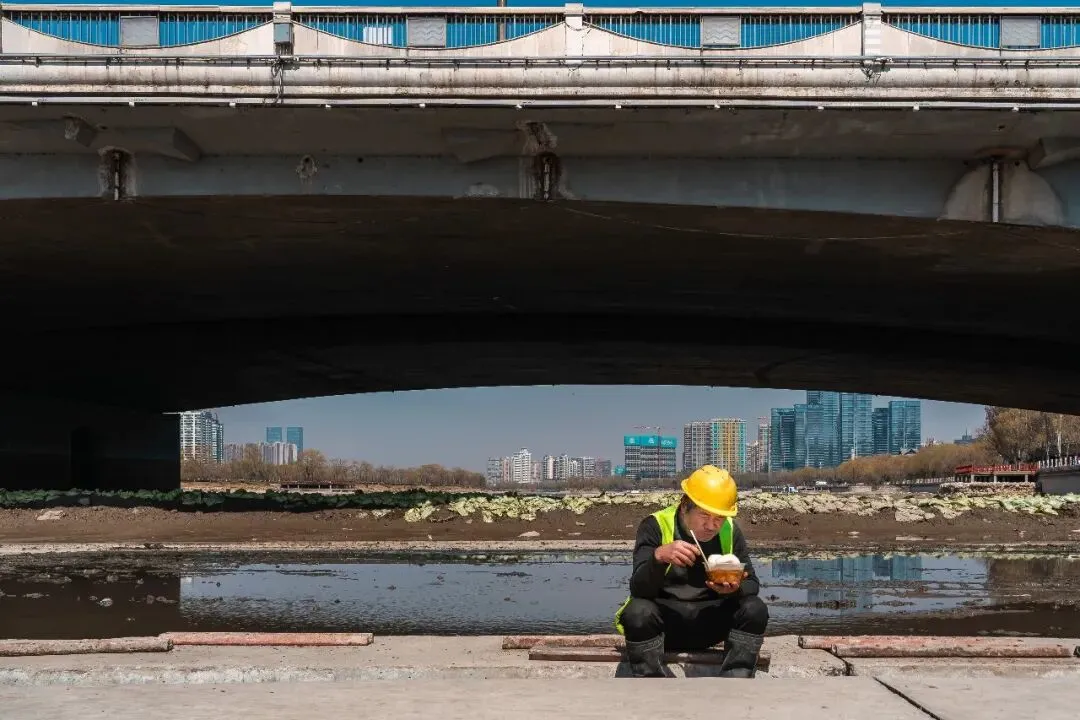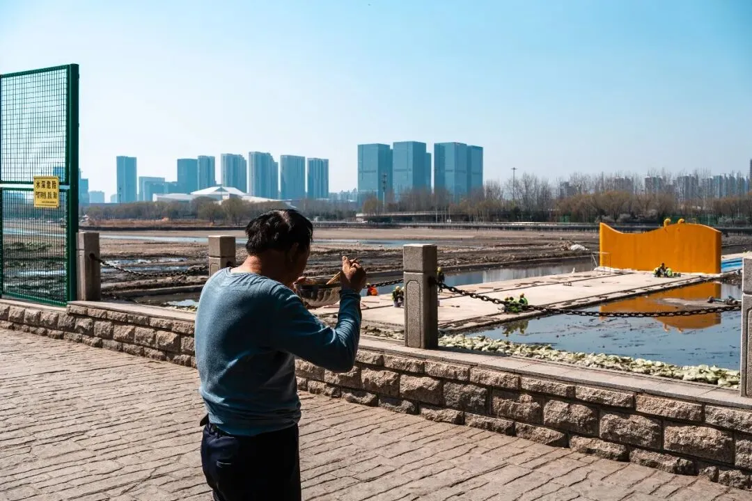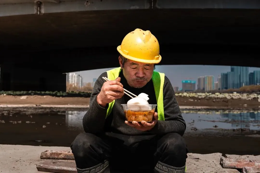 直到某个工作日中午,手里挂着相机,没有刻意的目的地,随心漫步到汾河边上,喧闹的城市似乎在正午时光慢了半拍,而河岸边的一幕,猝不及防撞进眼底——几位清淤工人在“干涸”的汾河河道里,手里捧着简单的盒饭,没有多余的交谈,只有偶尔的喘息和低头吃饭的安静,阳光落在他们沾满泥点的手上,也落在身后尚未清理完的河道里。我下意识举起相机,按下快门,定格下这最朴素的午休时刻,这便是《留白为生》的起点。
