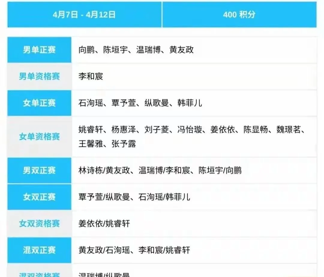此外,李和宸将征战男单资格赛,姚睿轩等九位女将亦全力冲刺女单资格。双打方面,男双有三对组合,女双两对,混双则有两对年轻搭档,其中不乏新配对的尝试,整体阵容充满活力与潜力。