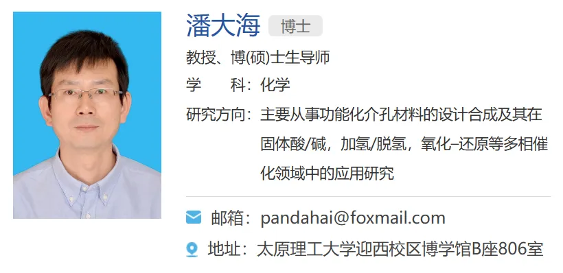 若您对功能化介孔材料合成、多相催化、固体酸碱催化、加氢脱氢反应等方向充满研究热情,渴望在优质团队指导下开展科研工作,可通过以下方式联系潘大海教授团队: