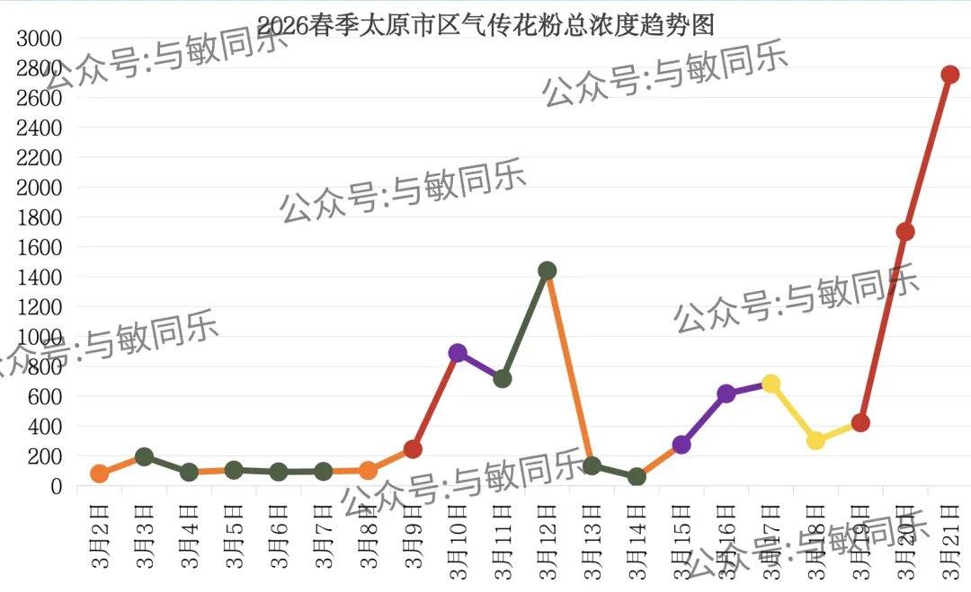 3月21日早8点至3月22日早8点:花粉总数≥801(粒/1000mm²),花粉总浓度为六级(花粉浓度极高)。