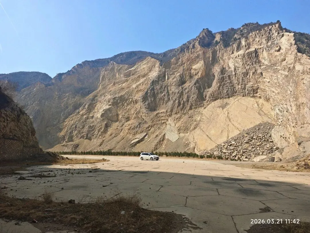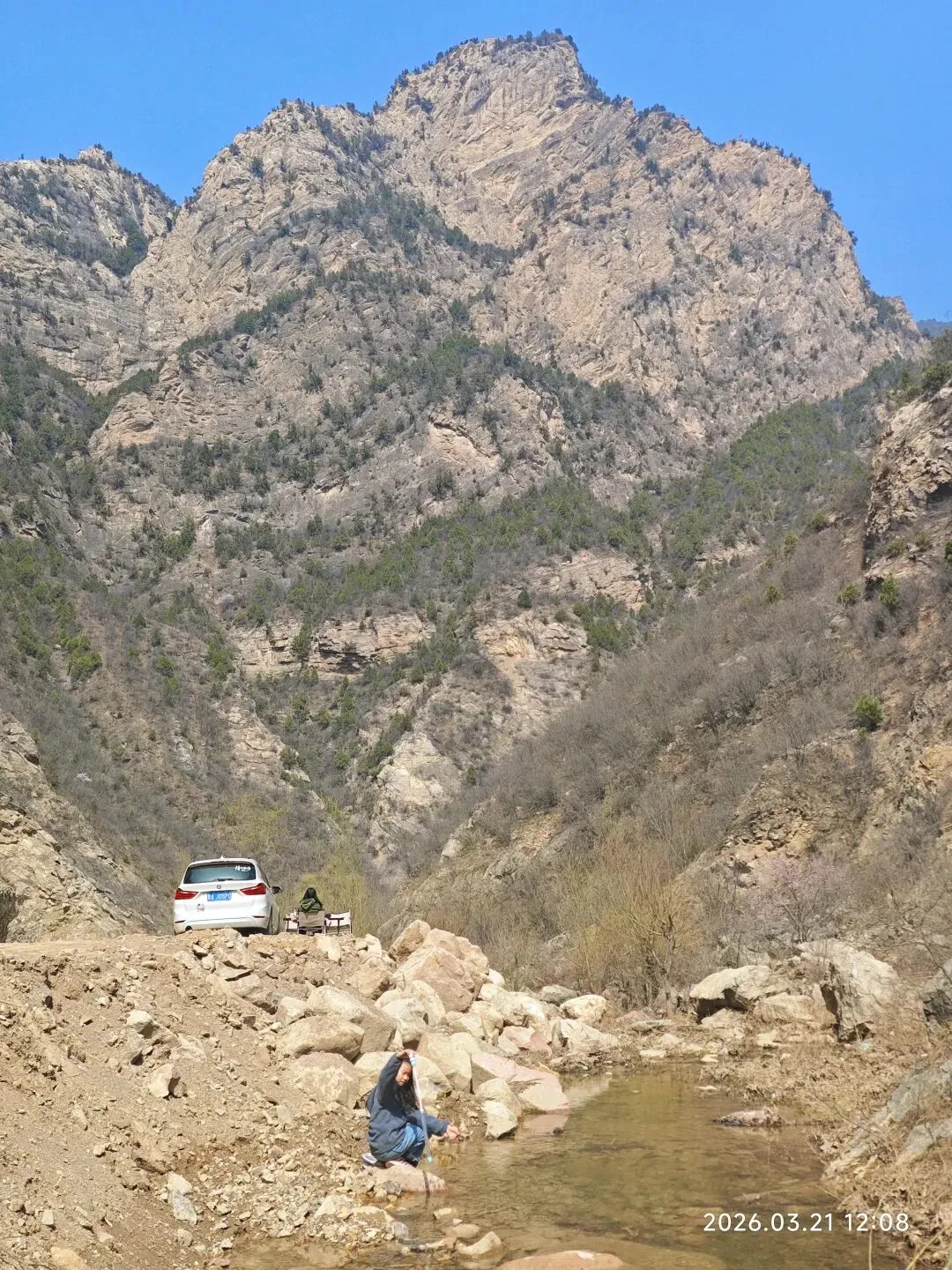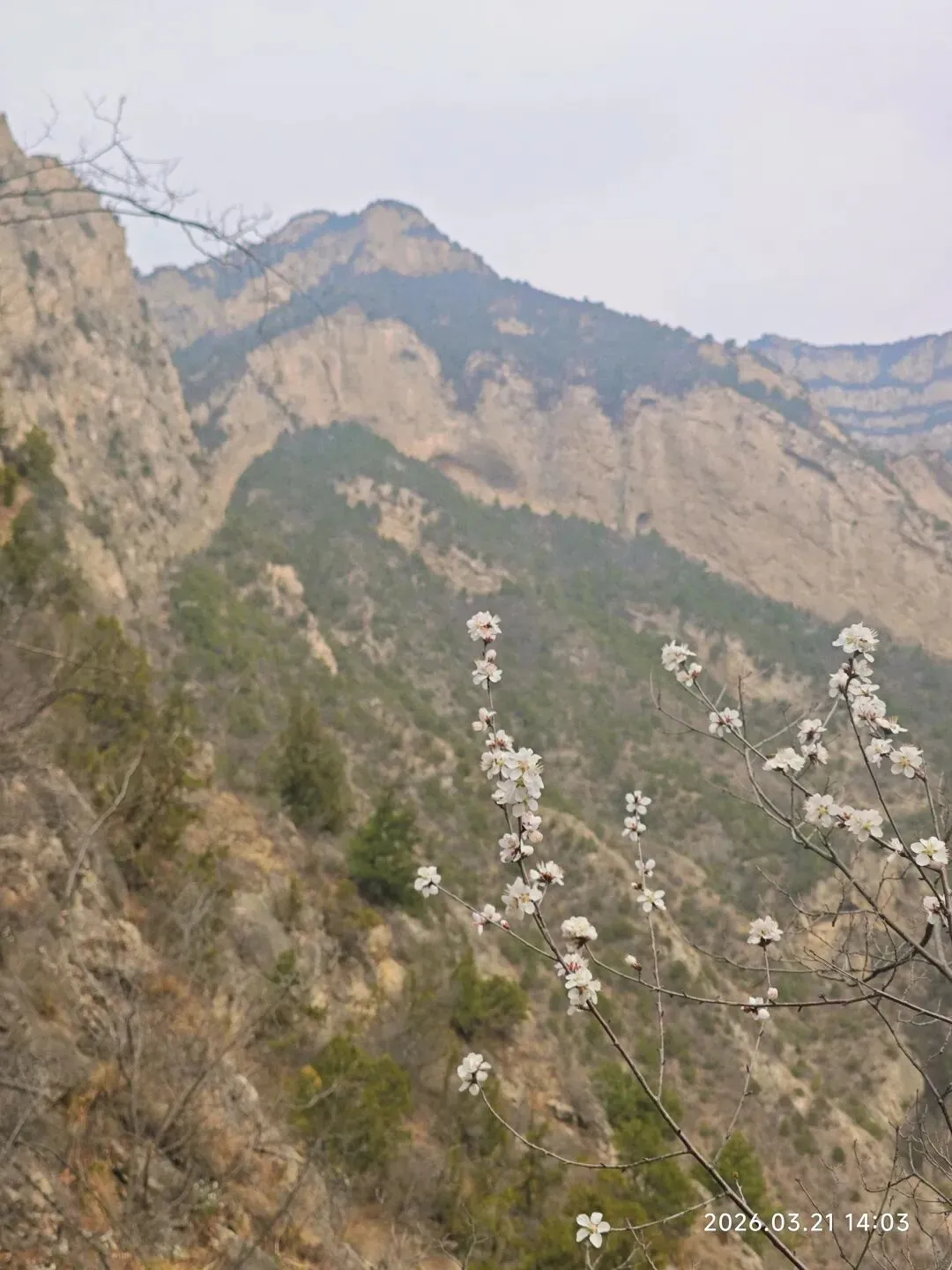 准备去文水隐唐洞的,然后我就用高德直接导航隐唐洞,也没提前做个攻略了解下路线,就出发了。10点出发,一小时车程,到了子夏山这边山谷大约11点。到了山谷口,发现这里的山峰还是蛮有压迫感的,瞬间觉得自己渺小如蝼蚁。来了才发现这里原来是军事管理区军用机场,山里都是地堡啊。回来查资料才知道这块是60年代修的机场,把山体都掏空了可以藏飞机。附近还有很多六七十年代的厂房办公楼遗址。沿着山谷一路前行,就来到了下图所示的一座雄壮的山峰之下。山谷里清泉流淌,风声细细,好天然的幽深山谷啊!快正午时分,就在这小溪边小坐了,把午餐吃了,孩子趁机玩了会水。水凉的心彻,却清澈无比,只是无鱼无虾!之所以在这里停了,因为这块刚好有徒步爱好者用那个红布条标记的一个登山路线,我看见半山腰有个红旗,我以为那就是隐唐洞目的地了。感觉也不高,估计不到一小时就能登上去,所以就在这吃完饭准备上山。人间四月芳菲尽,山寺桃花始盛开。到了这里只有山桃花在宣告着春天的到来,松柏稍稍拿着点绿色蜻蜓点水般的迎合着春意,其它处处还是黑压压的一片,等待着更热烈的春光唤醒。我们穿梭在丛林里,踩在碎石上,在山峰肌理间慢慢上行……唯独我们三人的趔趄行走,为这座山打破了些许的静谧。当我们休息时,发现地面上,树丛里,一朵朵娇小玲珑的淡紫色小花遍布满地!哦,原来除了山桃花,还有它们,也在宣告着春天的到来。它们个个渺小至极,不俯身坐下来,似乎都无法看见它们个个骄傲自得的盛开!山,依旧冷峻不语。我们爬到半山腰红旗所在处,才发现,此处顶多算中点,没有隐唐洞。