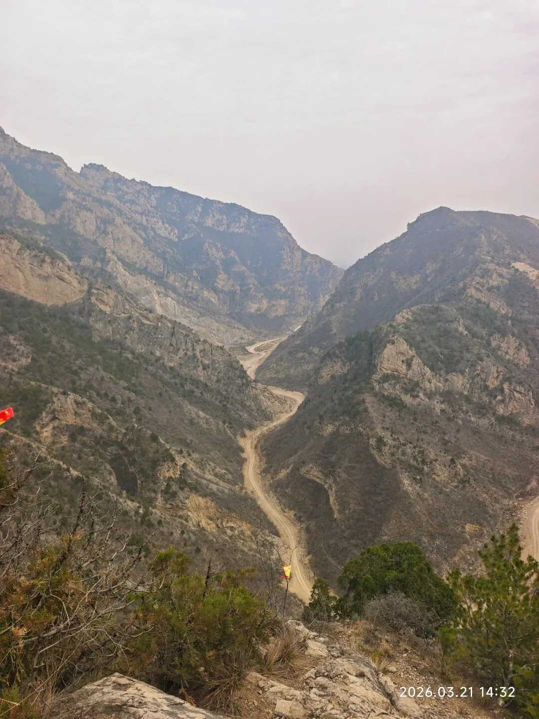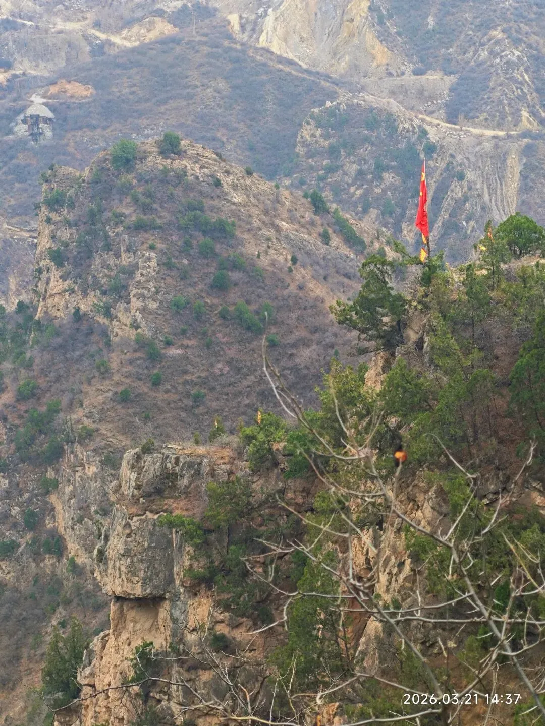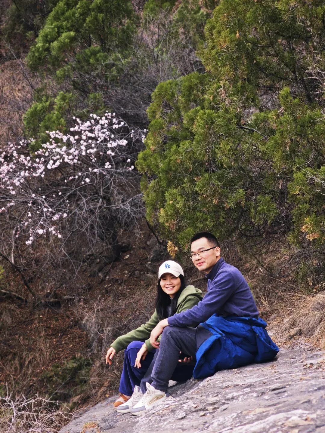 准备去文水隐唐洞的,然后我就用高德直接导航隐唐洞,也没提前做个攻略了解下路线,就出发了。10点出发,一小时车程,到了子夏山这边山谷大约11点。到了山谷口,发现这里的山峰还是蛮有压迫感的,瞬间觉得自己渺小如蝼蚁。来了才发现这里原来是军事管理区军用机场,山里都是地堡啊。回来查资料才知道这块是60年代修的机场,把山体都掏空了可以藏飞机。附近还有很多六七十年代的厂房办公楼遗址。沿着山谷一路前行,就来到了下图所示的一座雄壮的山峰之下。山谷里清泉流淌,风声细细,好天然的幽深山谷啊!快正午时分,就在这小溪边小坐了,把午餐吃了,孩子趁机玩了会水。水凉的心彻,却清澈无比,只是无鱼无虾!之所以在这里停了,因为这块刚好有徒步爱好者用那个红布条标记的一个登山路线,我看见半山腰有个红旗,我以为那就是隐唐洞目的地了。感觉也不高,估计不到一小时就能登上去,所以就在这吃完饭准备上山。人间四月芳菲尽,山寺桃花始盛开。到了这里只有山桃花在宣告着春天的到来,松柏稍稍拿着点绿色蜻蜓点水般的迎合着春意,其它处处还是黑压压的一片,等待着更热烈的春光唤醒。我们穿梭在丛林里,踩在碎石上,在山峰肌理间慢慢上行……唯独我们三人的趔趄行走,为这座山打破了些许的静谧。当我们休息时,发现地面上,树丛里,一朵朵娇小玲珑的淡紫色小花遍布满地!哦,原来除了山桃花,还有它们,也在宣告着春天的到来。它们个个渺小至极,不俯身坐下来,似乎都无法看见它们个个骄傲自得的盛开!山,依旧冷峻不语。我们爬到半山腰红旗所在处,才发现,此处顶多算中点,没有隐唐洞。