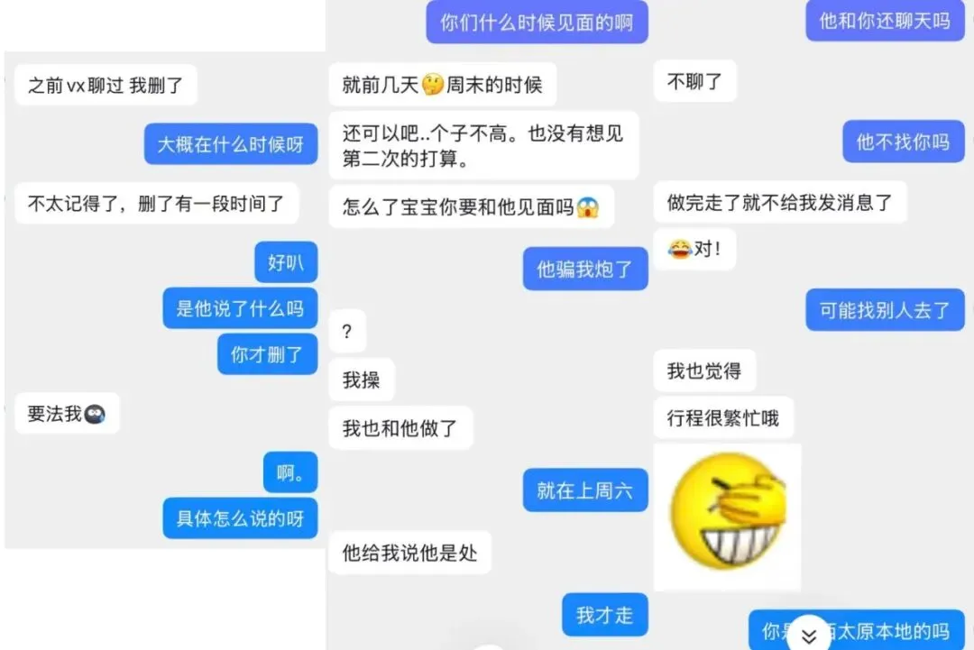 后我事主才知道,瓜主在周五到周六去找其他女生上🛏️并拍了她们的视频(在与我事主奔现前就和女生联系好了)。不仅如此,在与我事主恋爱期间,瓜主给多名女生发自己的🐮照并约线下见面,其中包括还在读高三的女生。