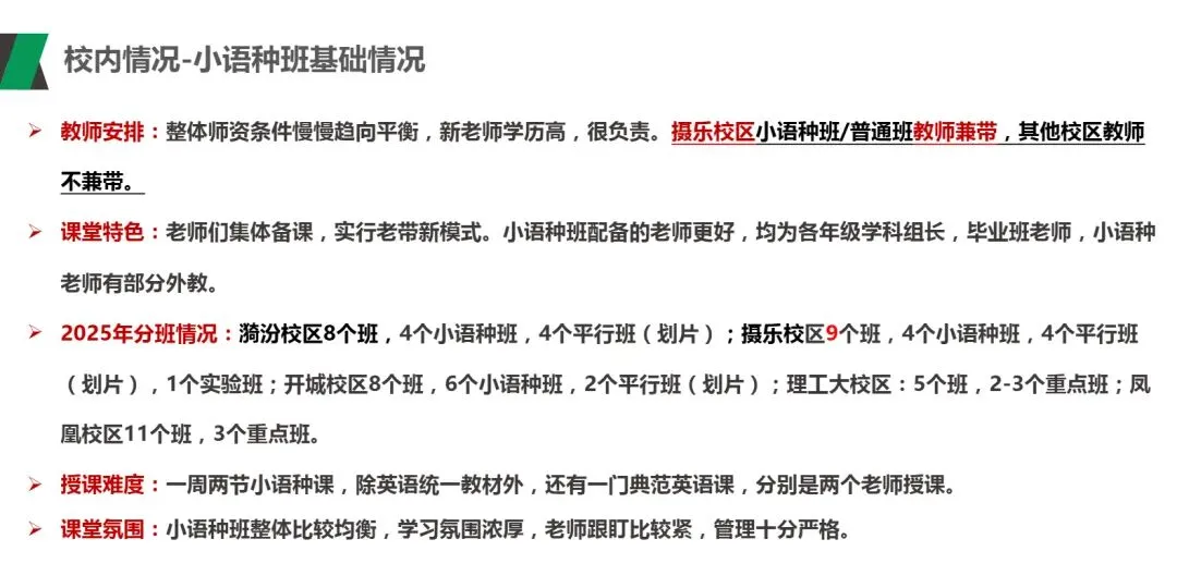 各校分班情况,一周两节小语种课,除英语统一教材外,还有一门典范英语课和二十一世纪报