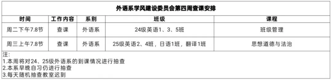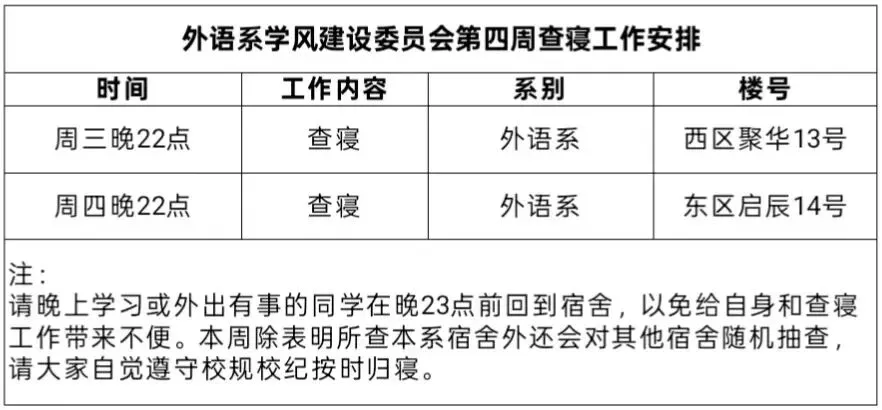 外语系学风建设委员会第四周协助老师查课查寝安排如下: