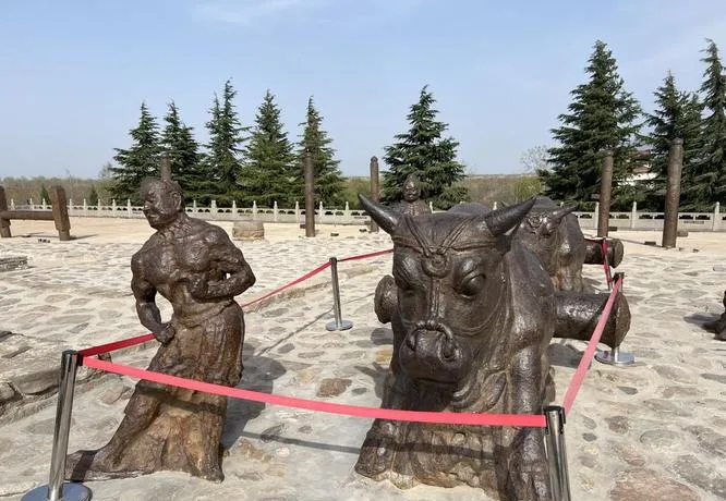 你去永济鹳雀楼,王之涣那首"白日依山尽,黄河入海流",不是随便写的,是站在这个楼上看着黄河拐弯处写的,你爬上去,看到黄河在脚下拐了个九十度的弯,那一瞬间你才明白,为什么古人说"欲穷千里目,更上一层楼",因为这个地方就是让你看清楚"中国的版图是怎么展开的"。你去看黄河大铁牛,四头铁牛镇在黄河边上,很多人以为是装饰,但真实情况是,这是唐代蒲津桥的桥墩,当年黄河上最繁忙的渡口就在这,南来北往的商队、使节都从这过,这四头铁牛不是文物,是整个唐朝物流体系的实体见证。