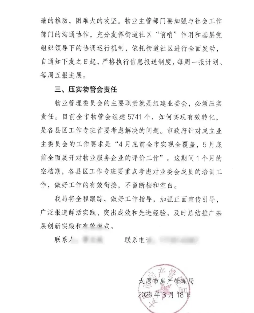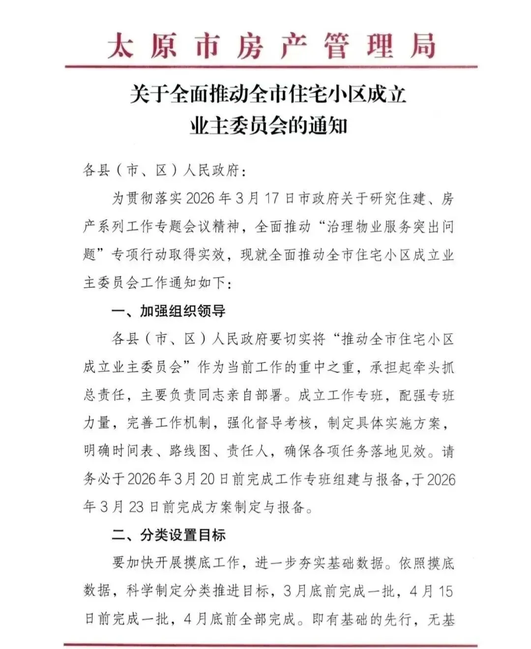 为贯彻落实2026年3月17日市政府关于研究住建,房产系列工作专题会议精神,全面推动"治理物业服务突出问题"专项行动取得实效,现就全面推动全市住宅小区成立业主委员会工作通知如下: