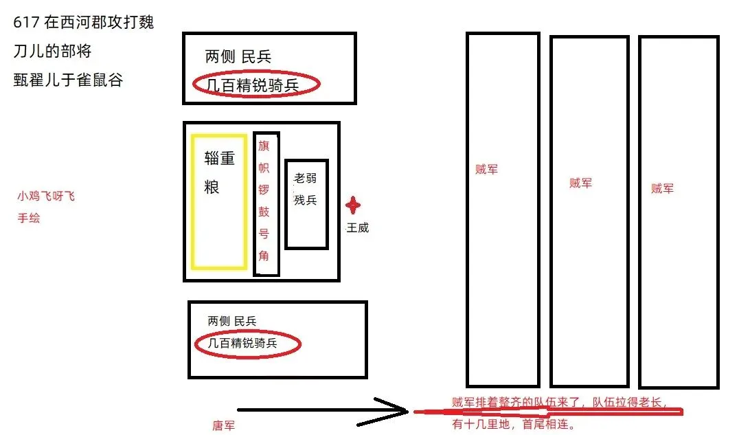 没过多久,贼军排着整齐的队伍来了,队伍拉得老长,有十几里地,首尾相连,慢慢朝李渊这边逼近。李渊马上把自己的军队分成两拨:把弱一点的兵放在中间,多插些旗帜,把所有的物资都放在后面,跟着旌旗、锣鼓号角,组成一个大阵;又把几百个精锐骑兵,分别安排在左右两边,组成小阵。大伙都不明白李渊为啥这么安排。开打了,李渊让王威带着大阵在前头,旌旗跟着。贼人远远一看,以为李渊就在里头,就带着精锐部队争着去打王威。等看到物资,贼人就都扔了装备去抢。王威吓得从马上摔下来,手下人把他扶起来才跑掉。这时候,李渊带着小阵的左右两队,大喊着往前冲,从两边射箭杀贼人。贼军一下子乱了套,李渊趁机指挥军队全面出击,一路势如破竹,杀了和抓了好多贼人。剩下的贼党,老的小的、男的女的好几万人都来投降。于是,郡境得以安宁,没人抢粮食了,百姓对李渊的恩德感激不已,犹如大旱之后迎来甘霖。(图4)