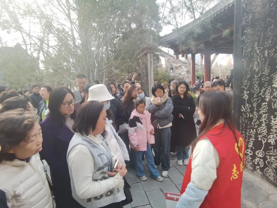此刻,碑林公园外早已是人头攒动,慕名而来参观的游人排起了长队。大家随后排队入园。为了让会员们更深入地了解碑林公园的历史底蕴与文化内涵,读书会还特别邀请了专业讲解志愿者讲解。讲解员结合公园的发展历程,详细介绍了碑林公园的建园始末、园区布局以及碑石收藏情况,全园分为北园傅山碑林与南园三晋碑林,共藏有418方碑石,承载着丰富的晋阳文化记忆。